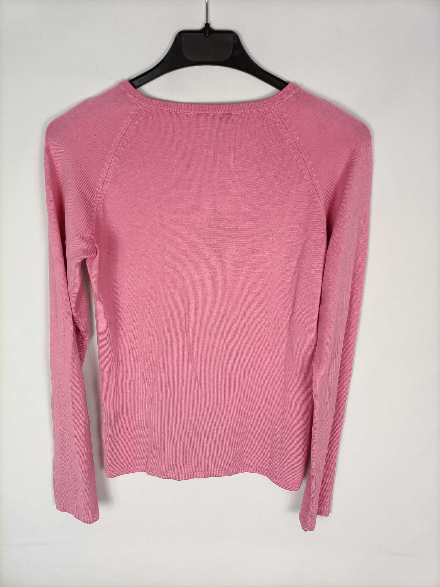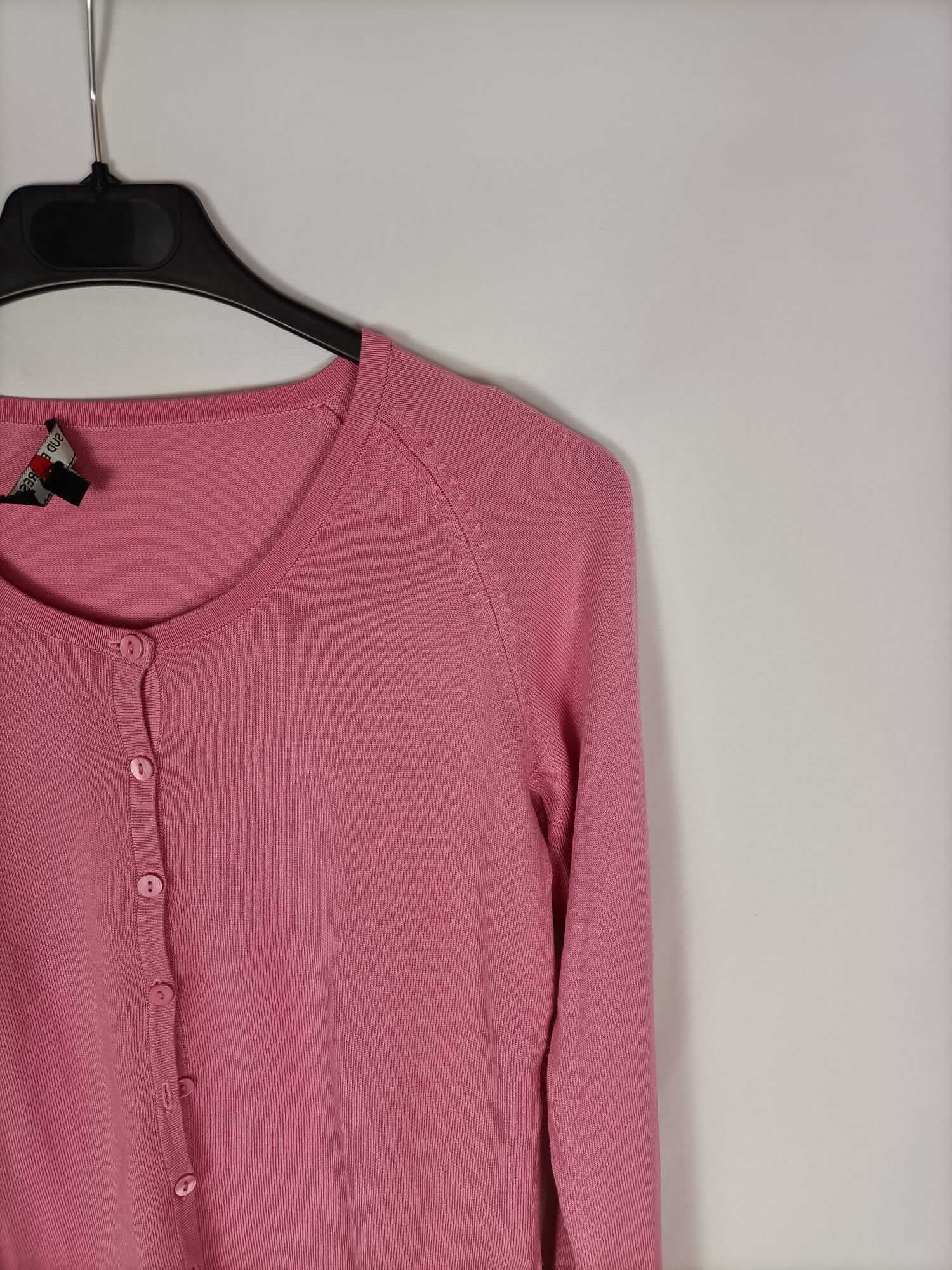 Sud Express. Pink buttoned, stretch knit cardigan. 56 cm long.