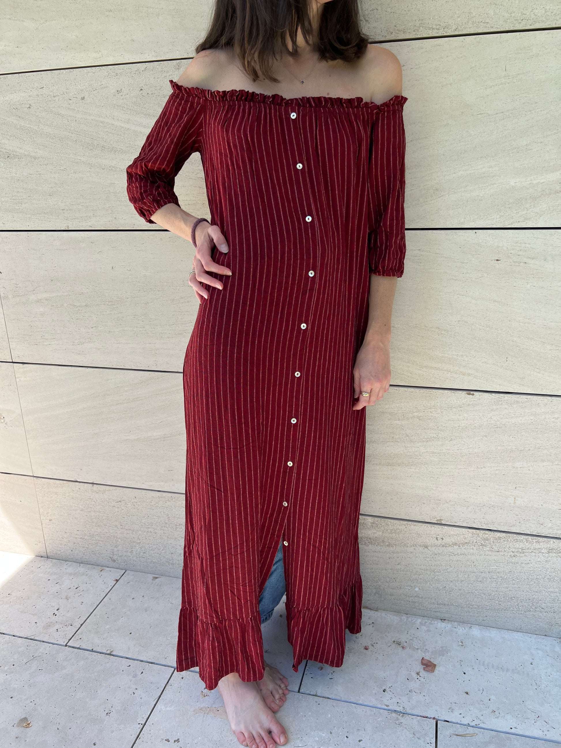 Vestido largo burdeos con detalle de hilos plateados. Abotonado y cuello barco