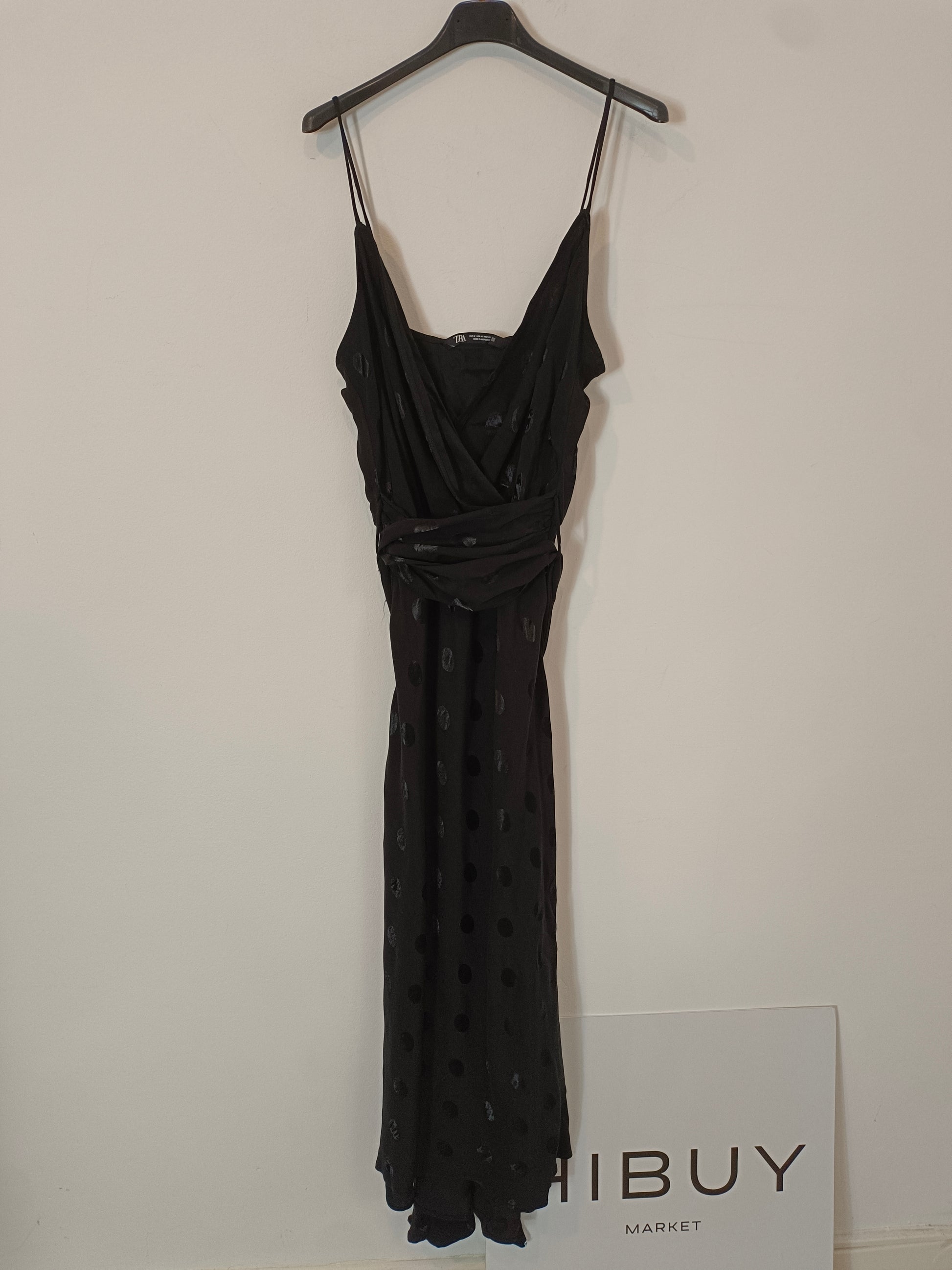 vestido largo negro con estampado de lunares. Cintura elástica con cinturón