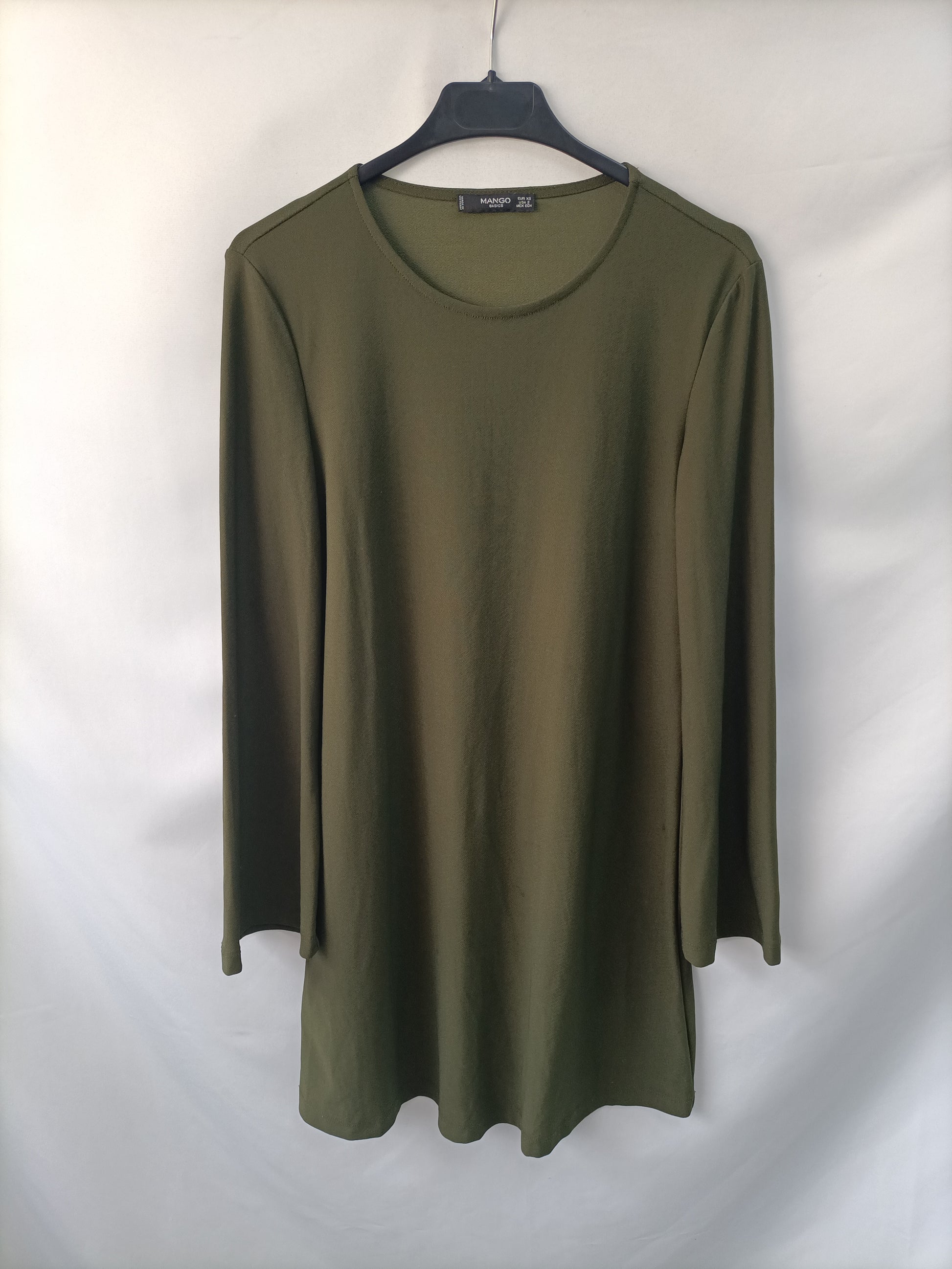 Mango. Flowy, stretchy green short dress with bell-shaped sleeves. 81 cm long. Polyester and elastane.