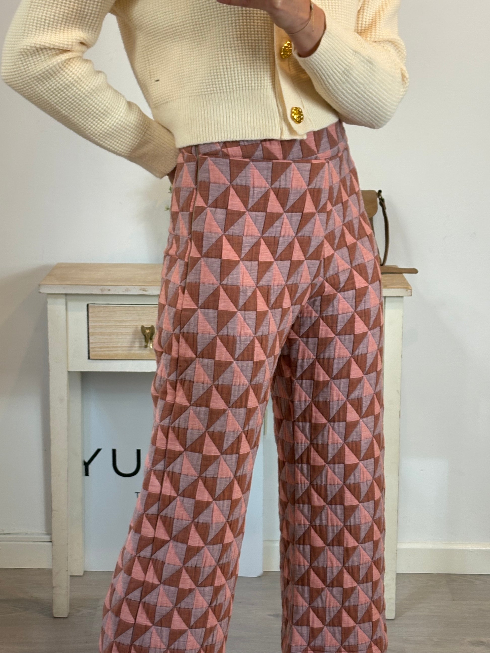 Quilted diamond-patterned wide-leg trousers. Cotton fabric. Non-stretch. Waist 35 cm, length 106 cm.