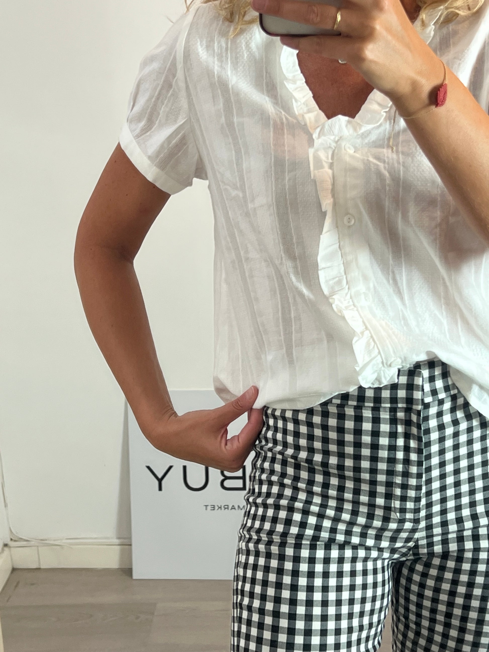 Textured cotton blouse with short sleeves and ruffles. 100% cotton. Size S/M.