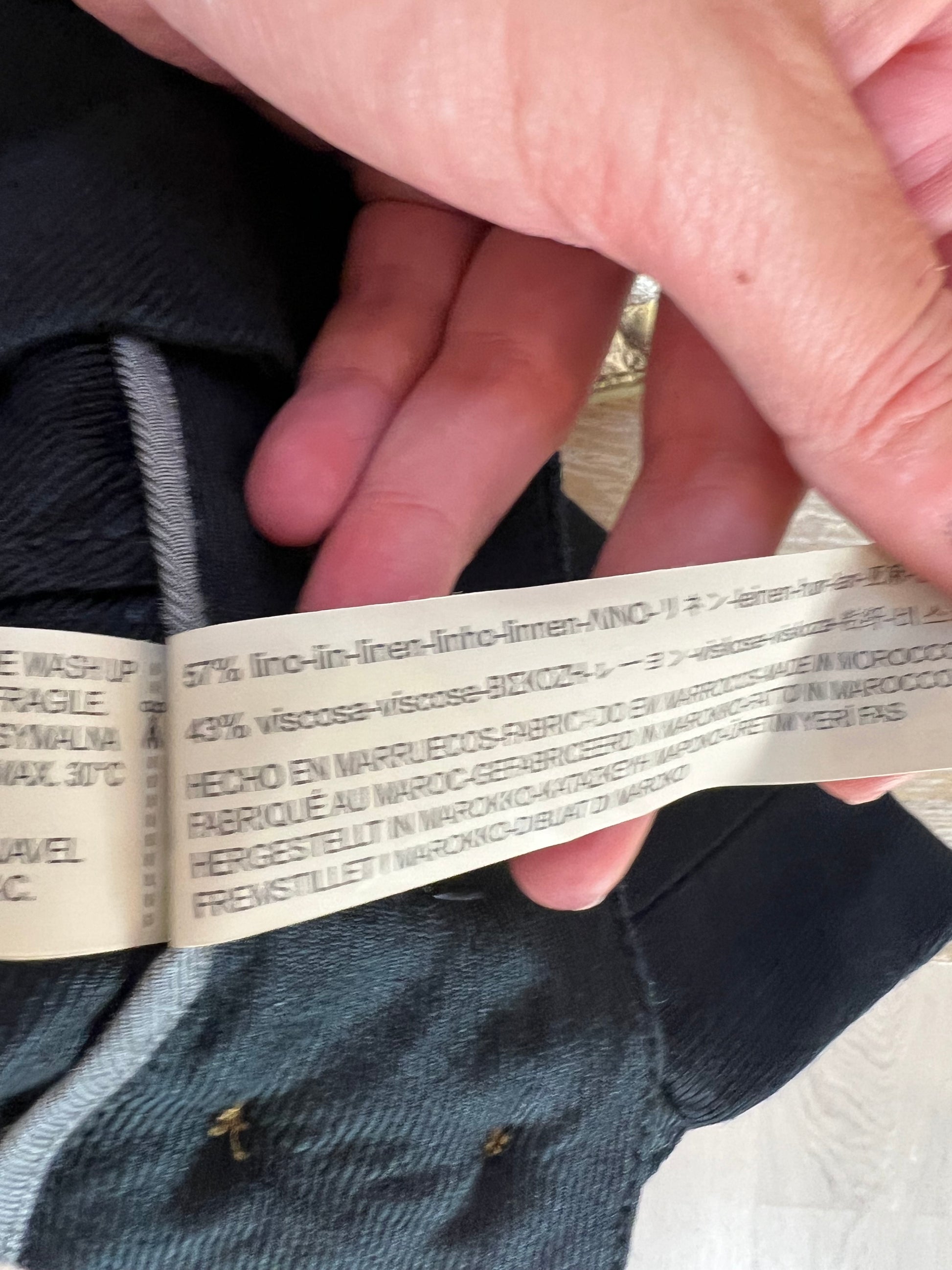 Dark blue buttoned linen and viscose midi skirt. Waist 32cm, length 79cm.