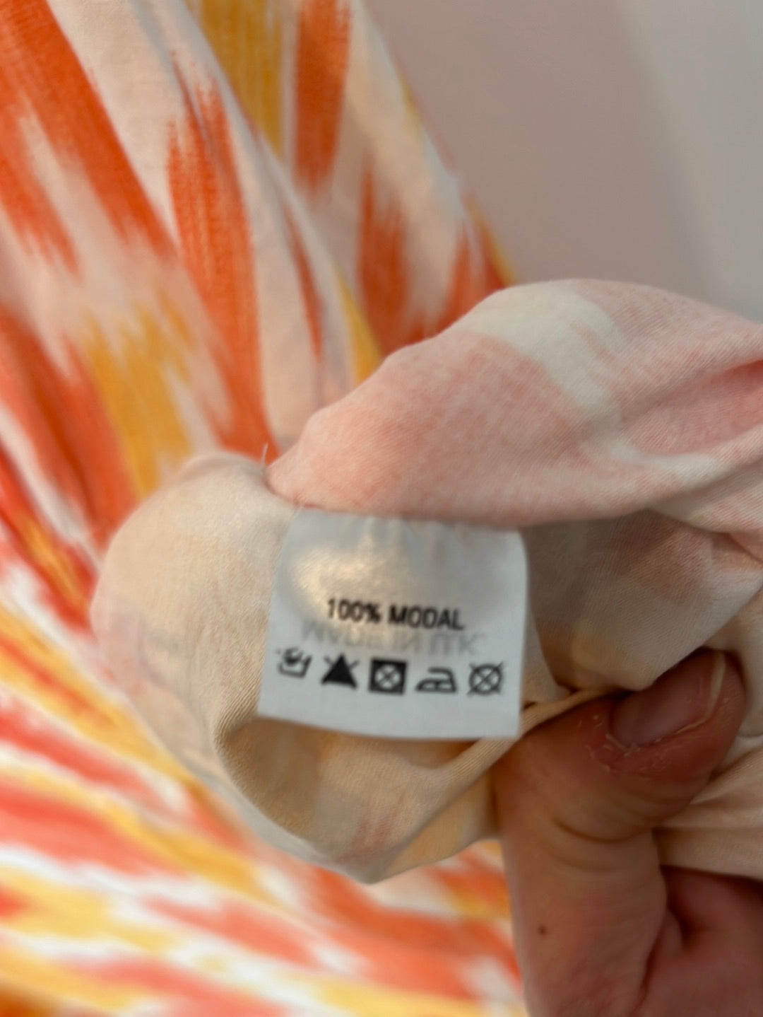 Short kaftan-style dress with orange and yellow print. Length 79 cm.