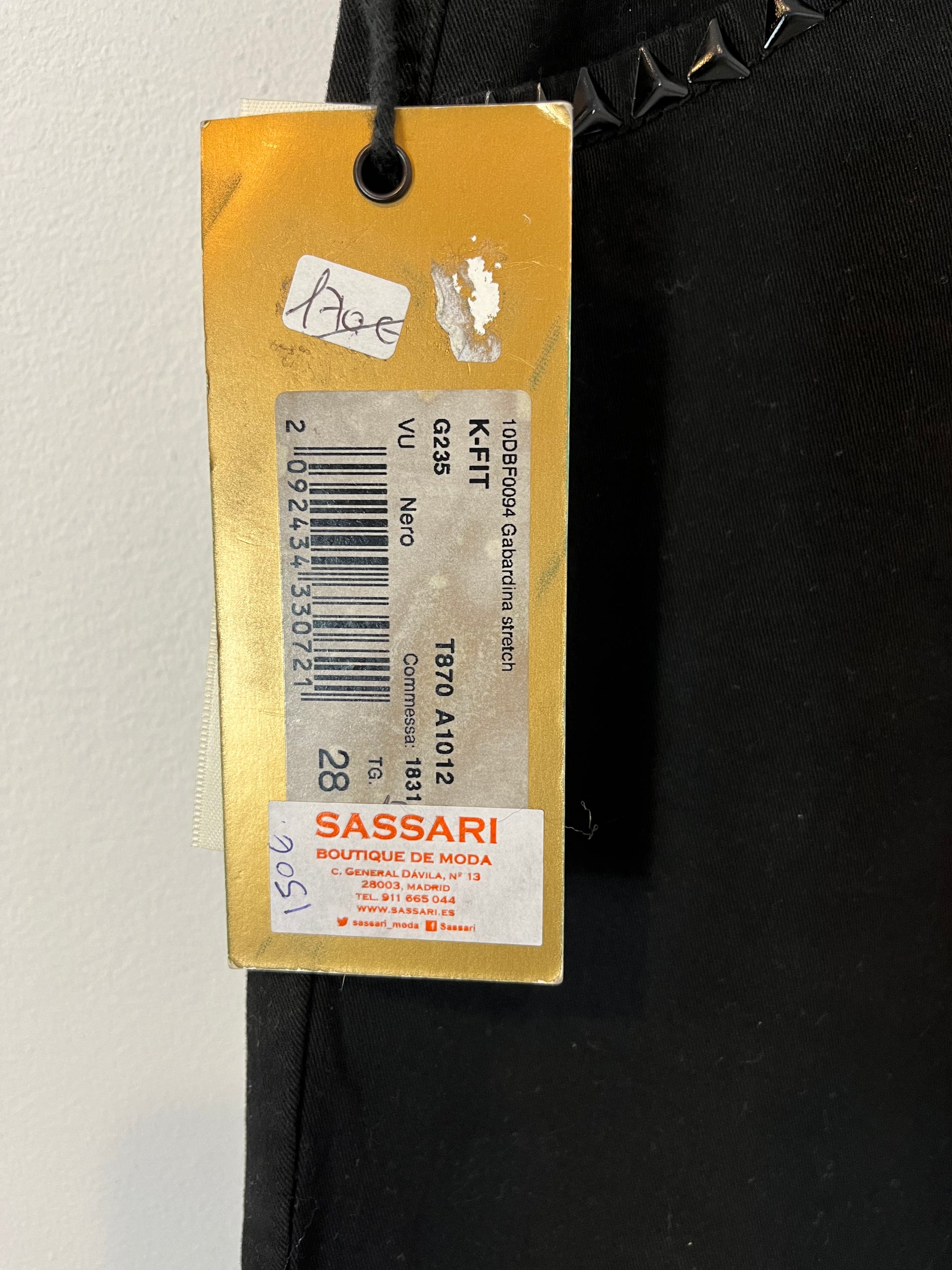 Semi-elastic. Low waist 39 cm, length 95 cm. Mini branding on the back of the pants (photo).