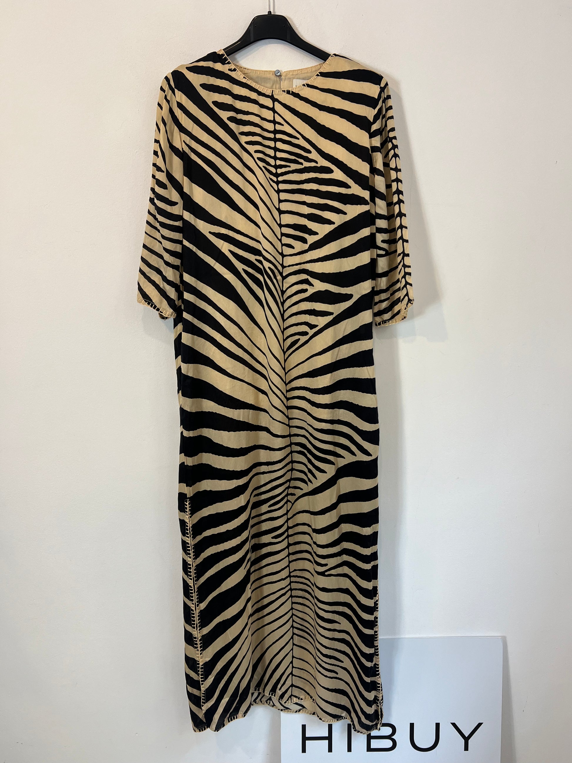 Long camel and black animal print silk dress. Flaws: faint stains and some snagging. Armhole to armhole: 50 cm; length: 135 cm.