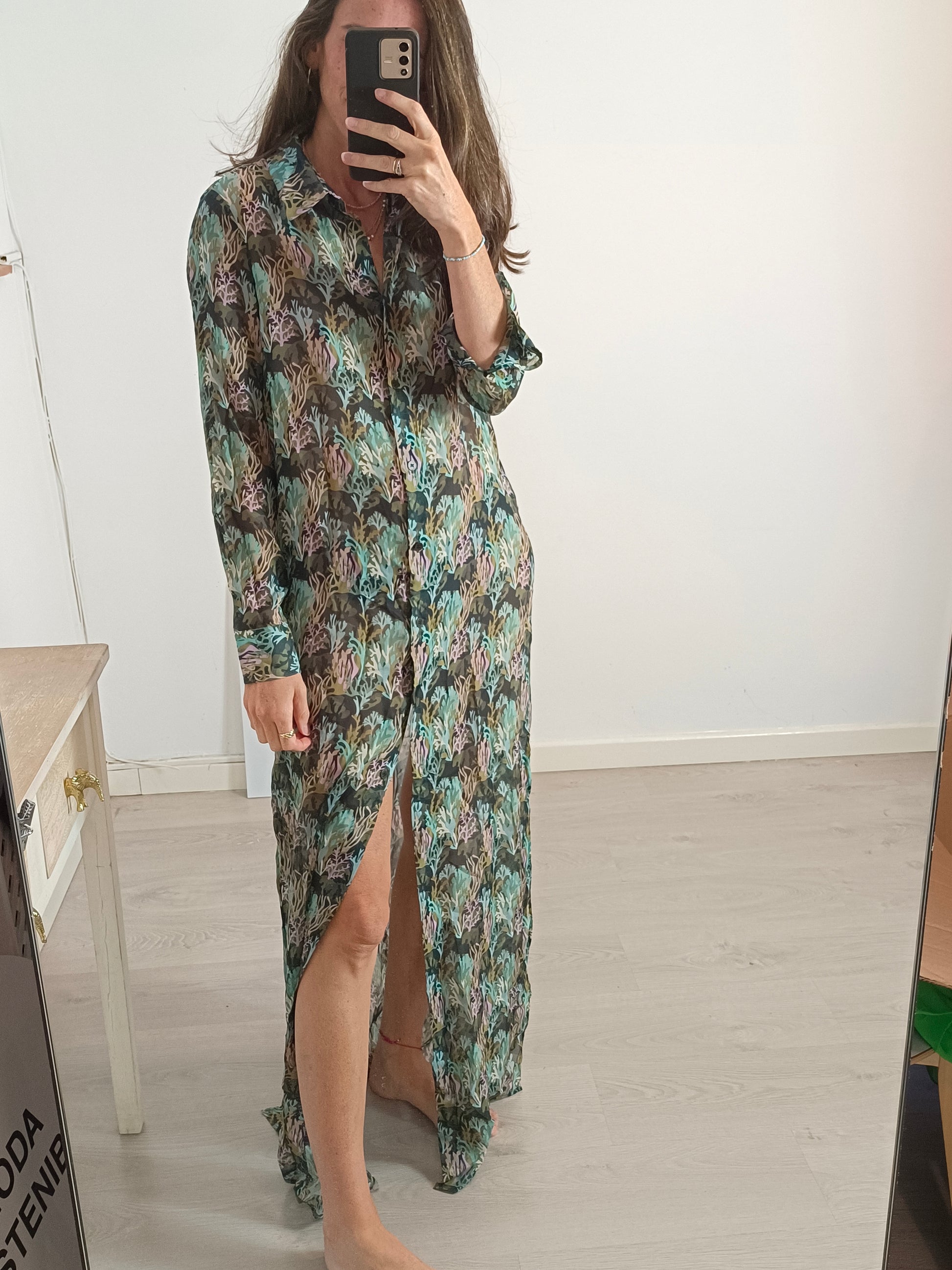 Long coral-print dress. Semi-sheer and buttoned. 100% silk. Armhole to armhole 49 cm, length 143 cm.