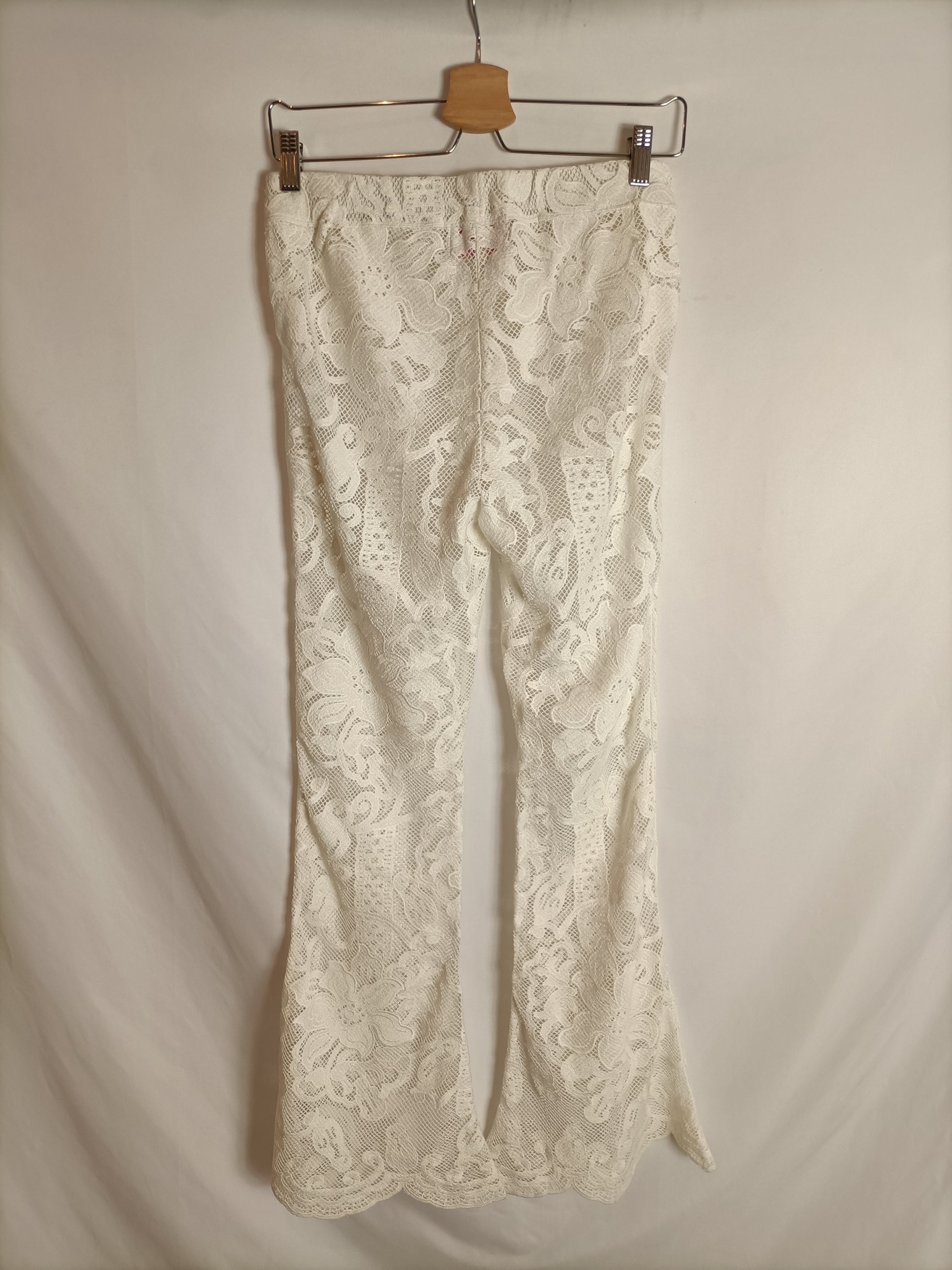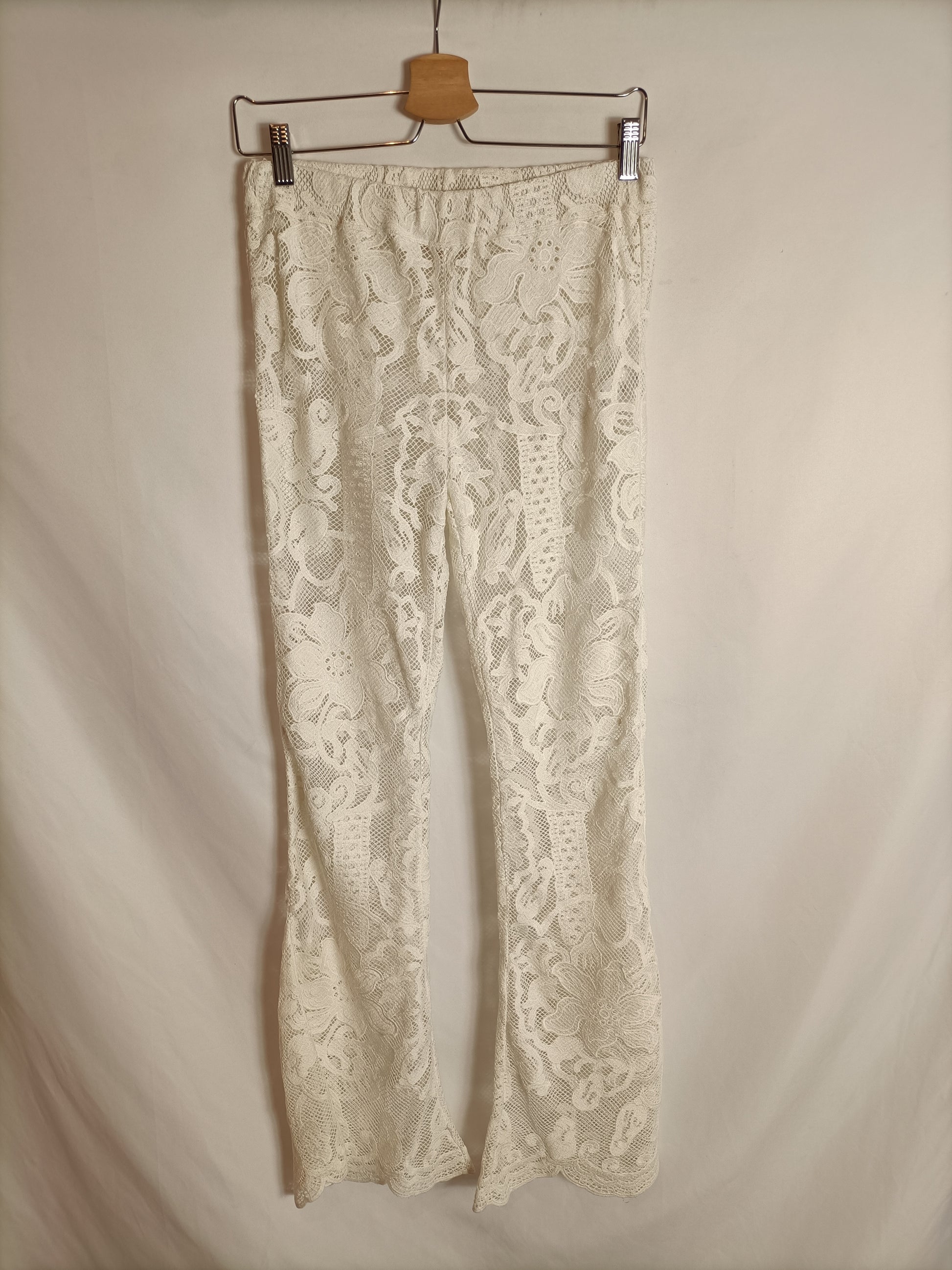 White semi-sheer lace pants. Elastic waist. 36 cm, length 109 cm.
