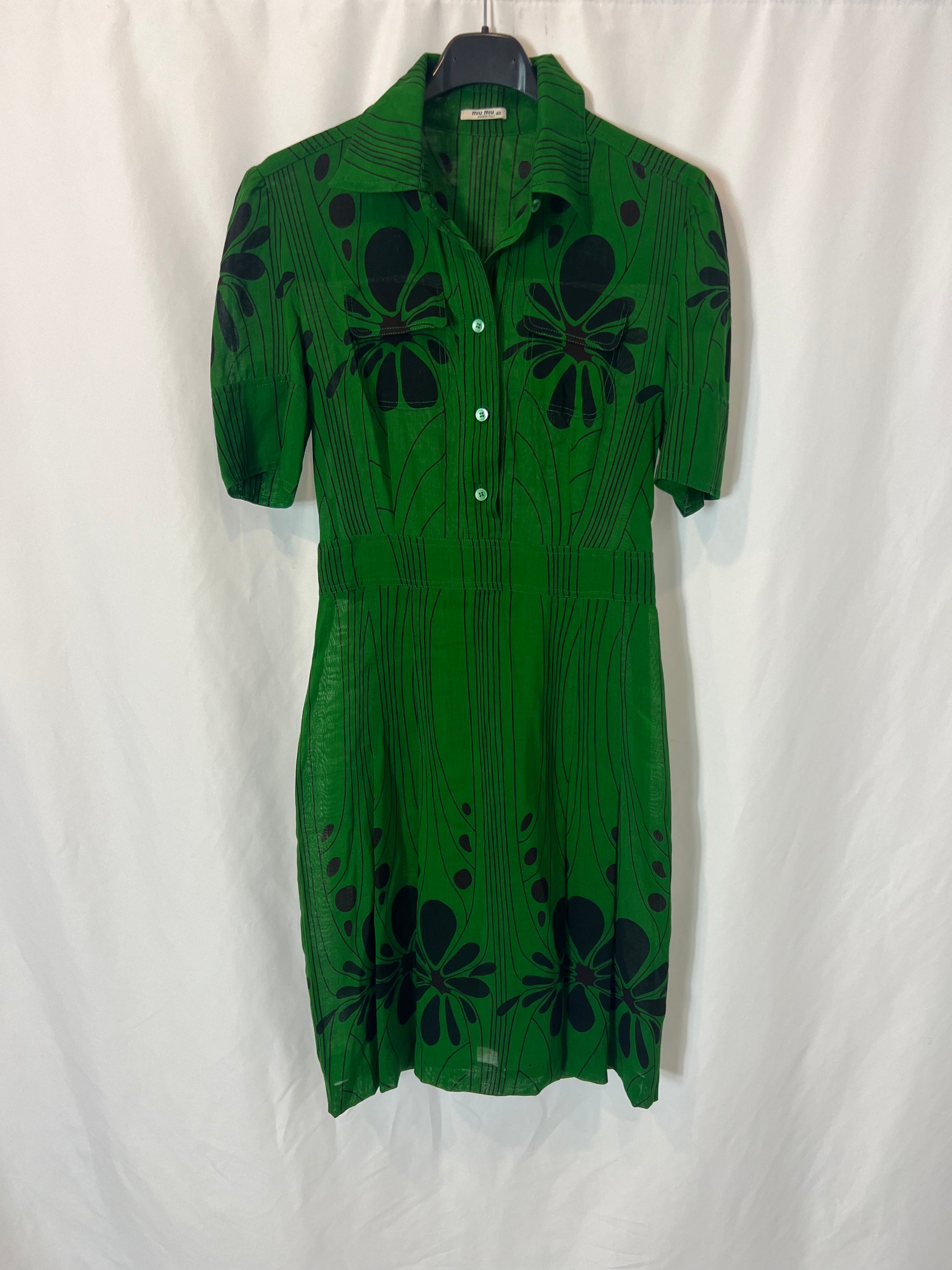 Short green dress with black print. Black detailing. Pleated skirt. Vintage. 42 cm from waist to armhole, 33 cm from waist, 94 cm from length.
