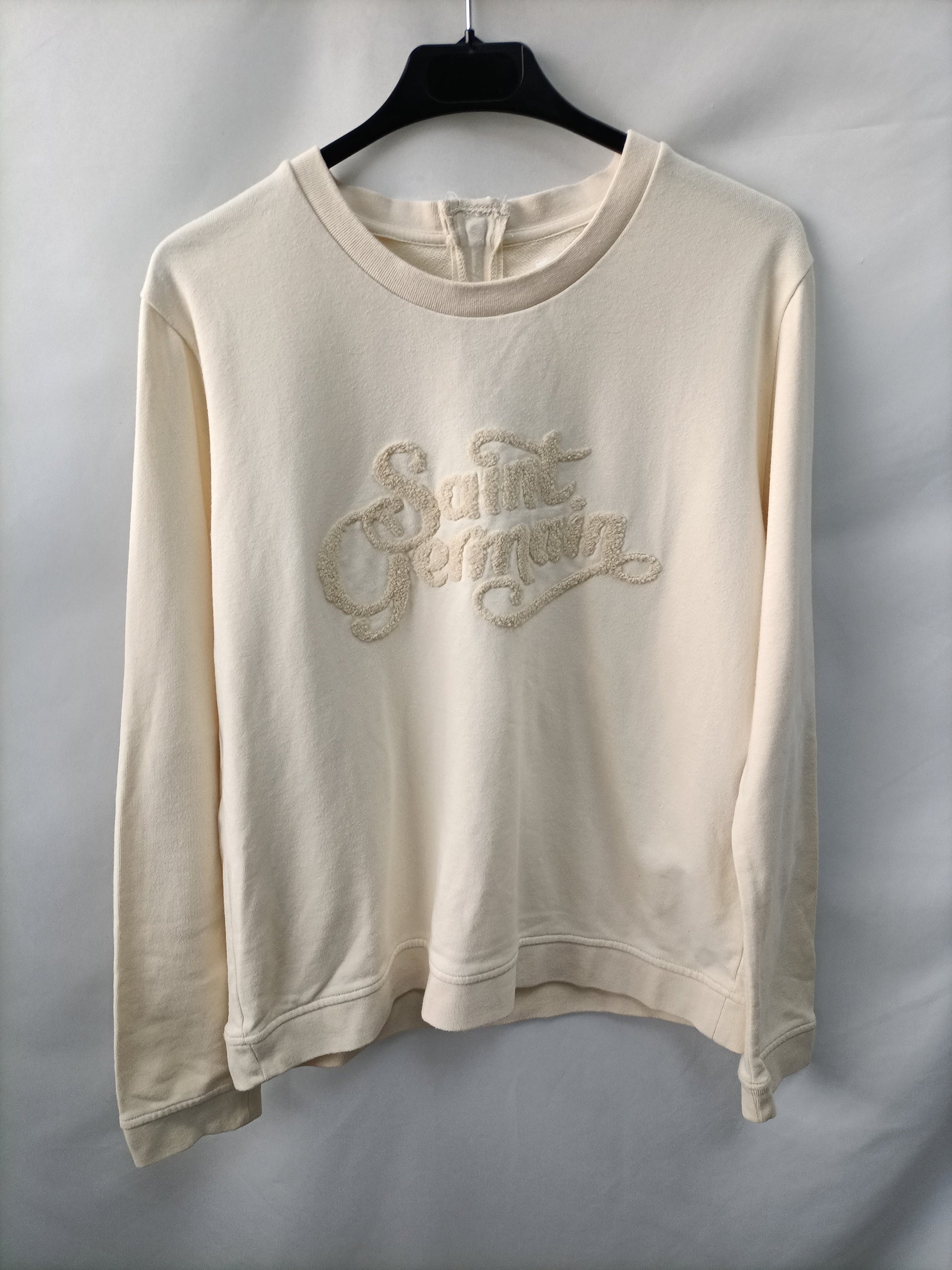 Beige sweatshirt with "Saint Germain" sheepskin lettering and elbow patches. Elastic. 61 cm long.