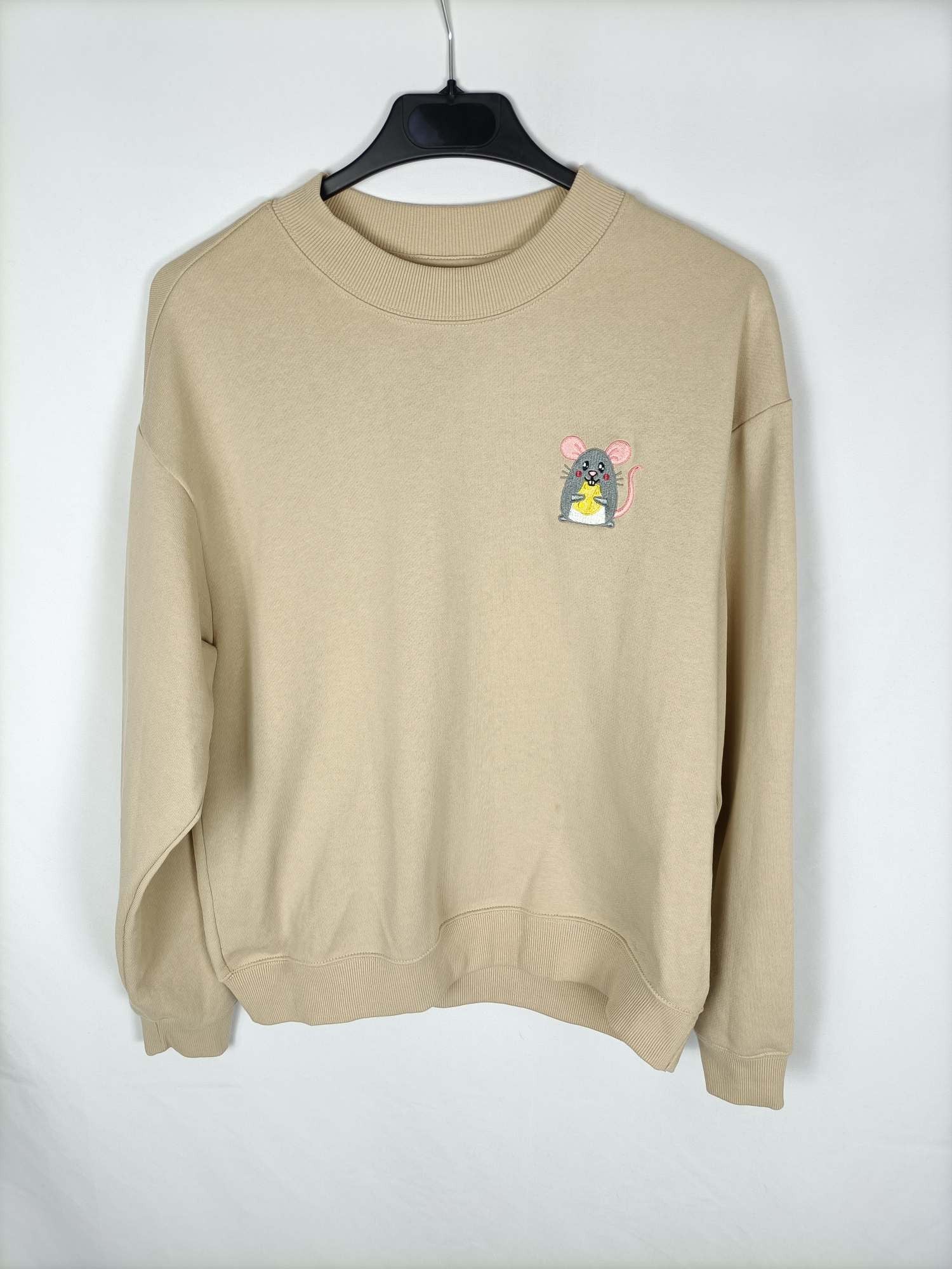 Monki. Sudadera beige con un ratón bordado. Elástica. Largo 64 cm