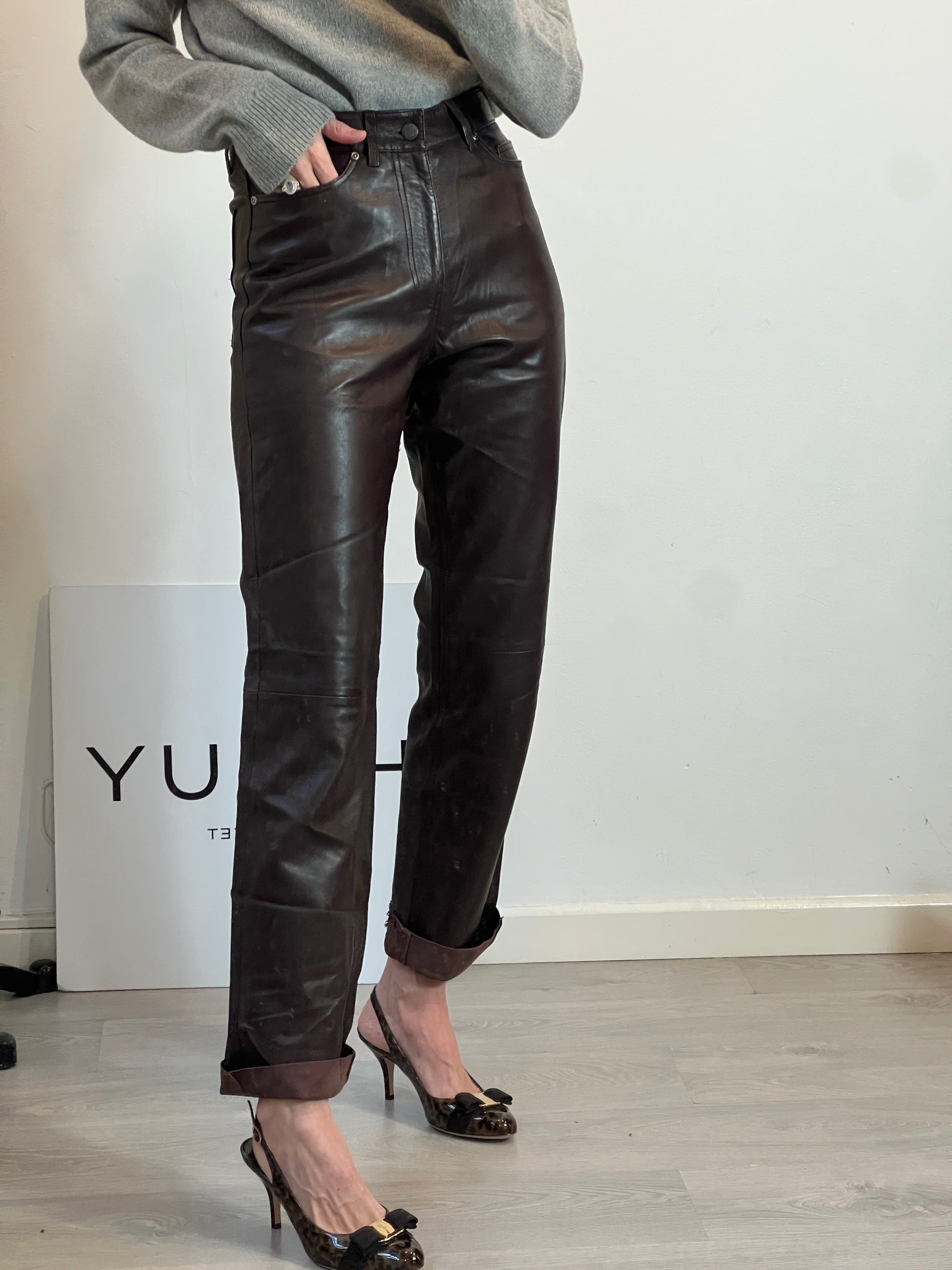 Pantalón recto marrón de piel. Cintura 36cm, largo 101cm