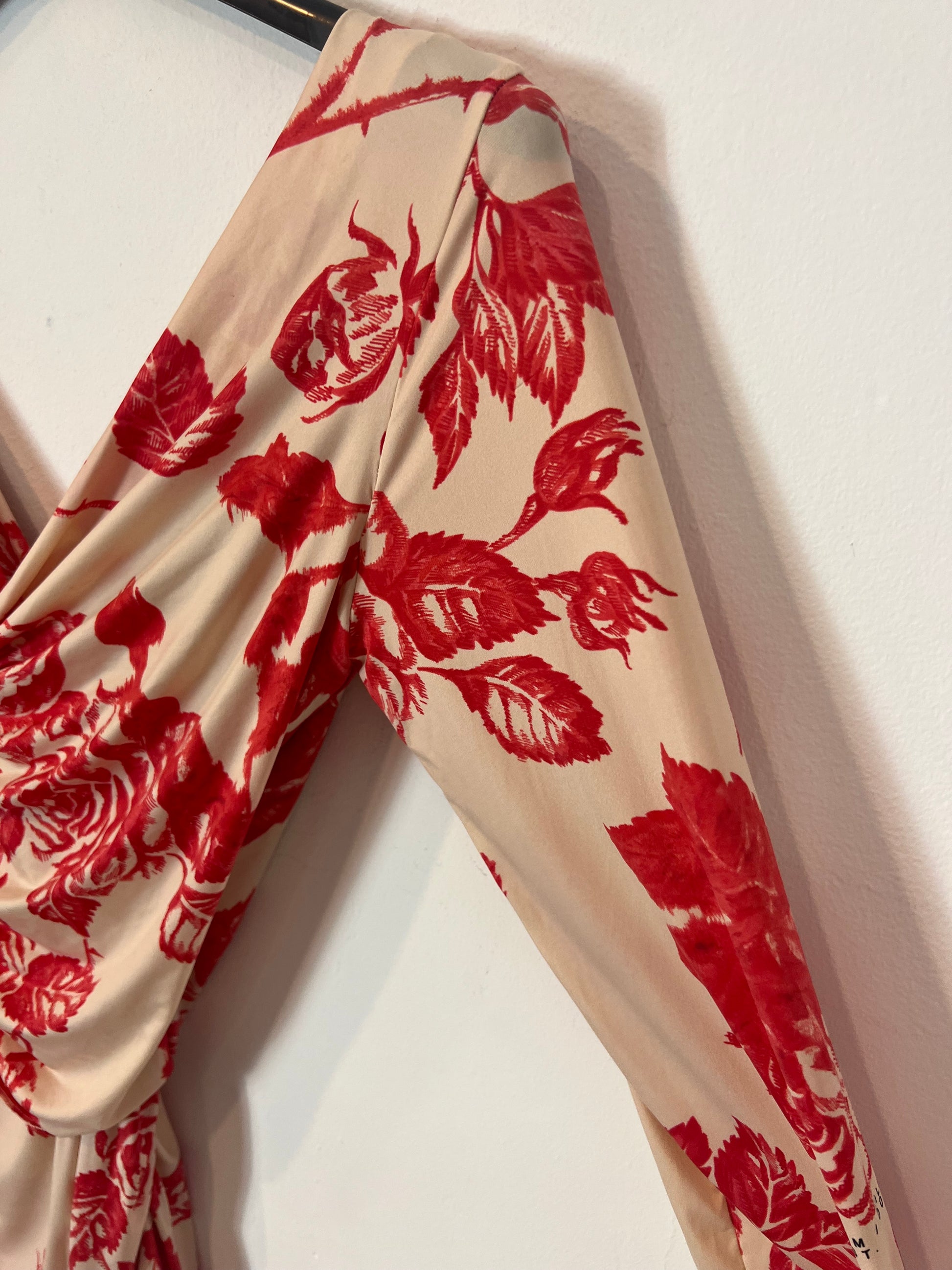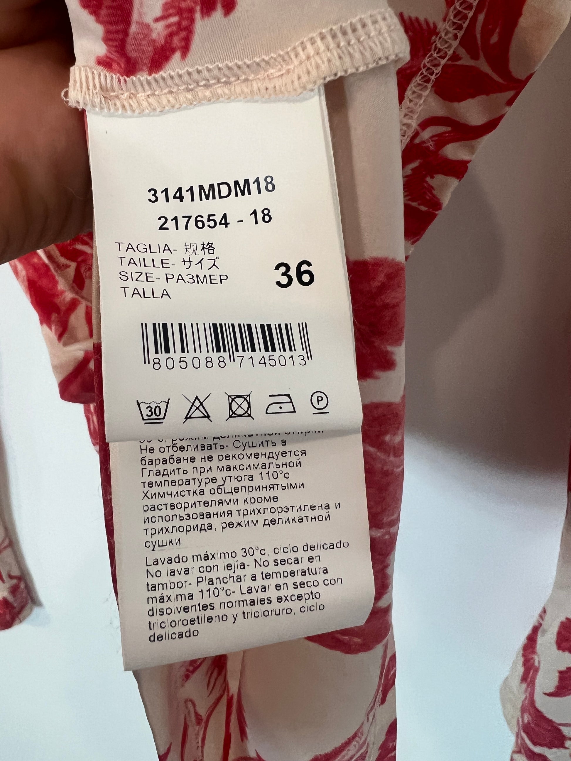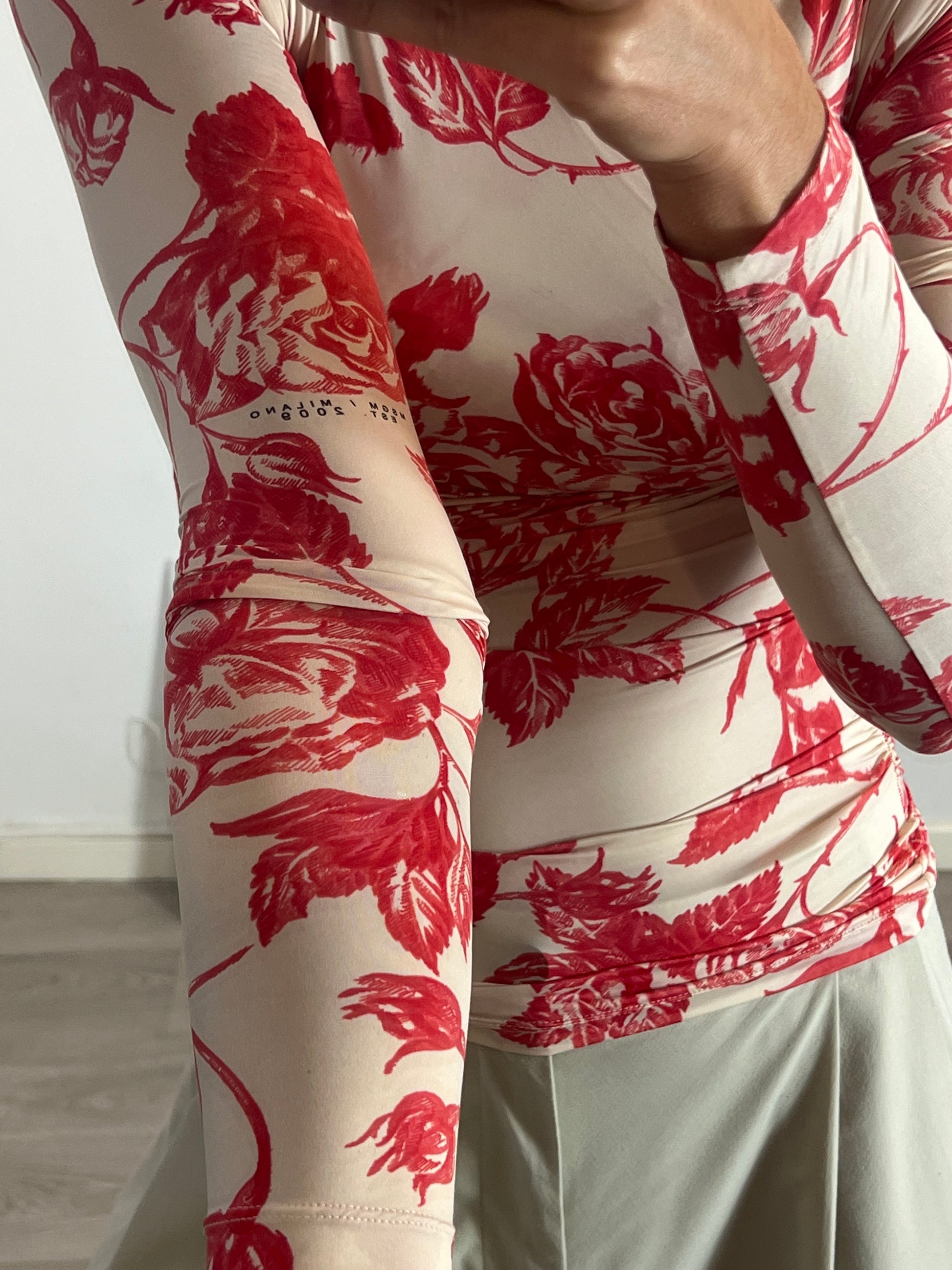 Beige and red two-tone top. Elastic. Length 63 cm.