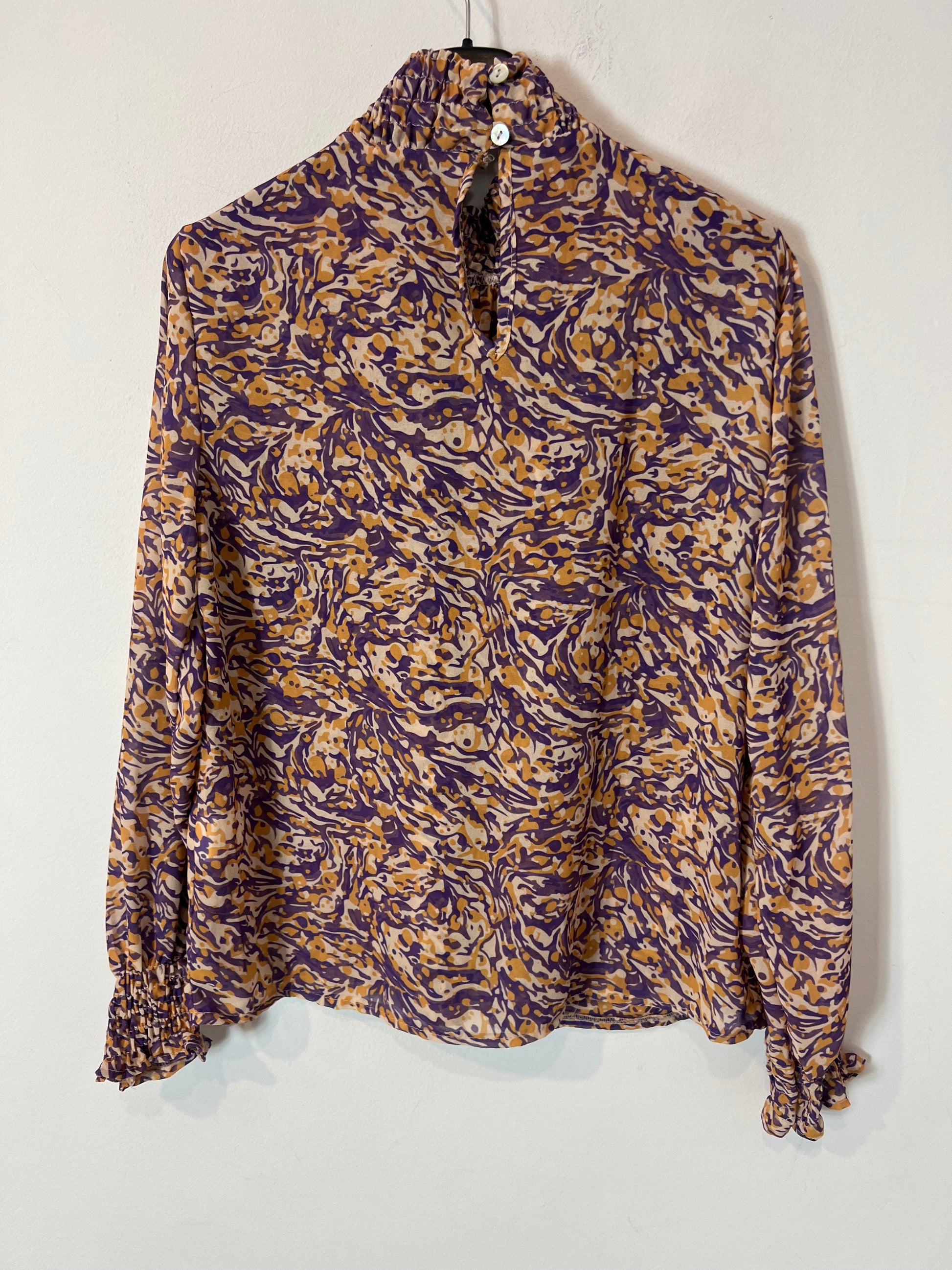Flowy beige blouse with a mustard and purple print. 18" (46 cm) from armhole to armhole and 22" (57 cm) long.
