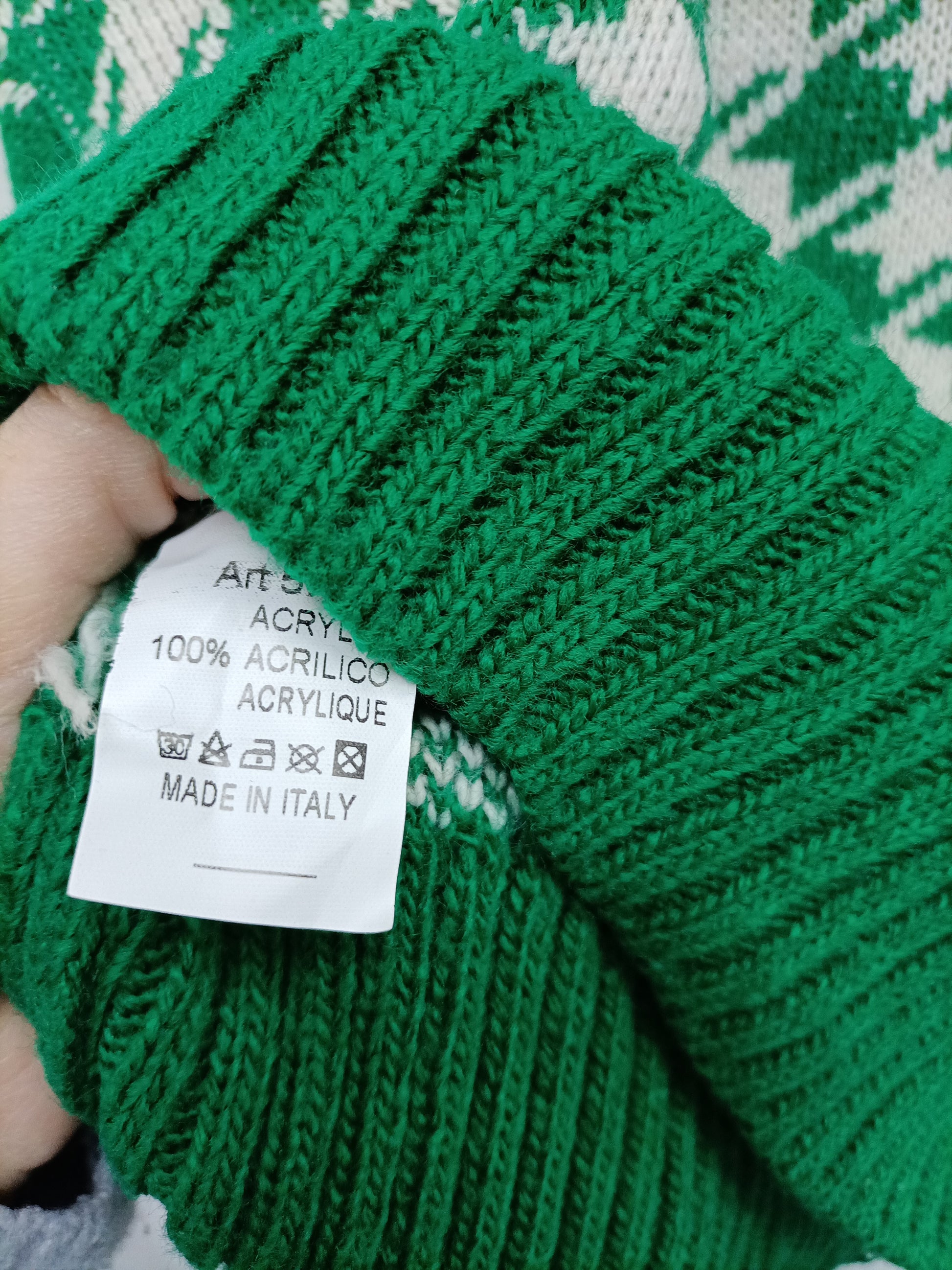 Green and beige houndstooth cardigan with pearl buttons and stretch. Length 55 cm.