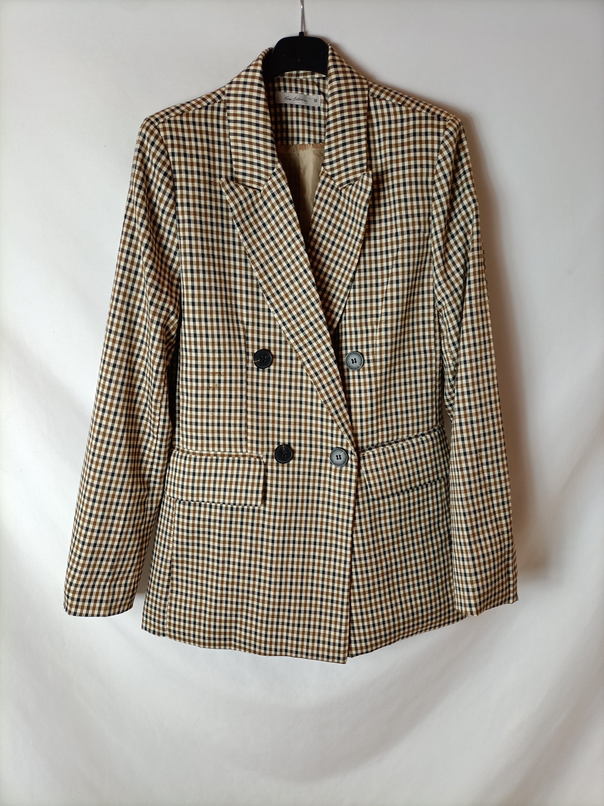 Brown and black checked blazer. Beige background. Length 74 cm.