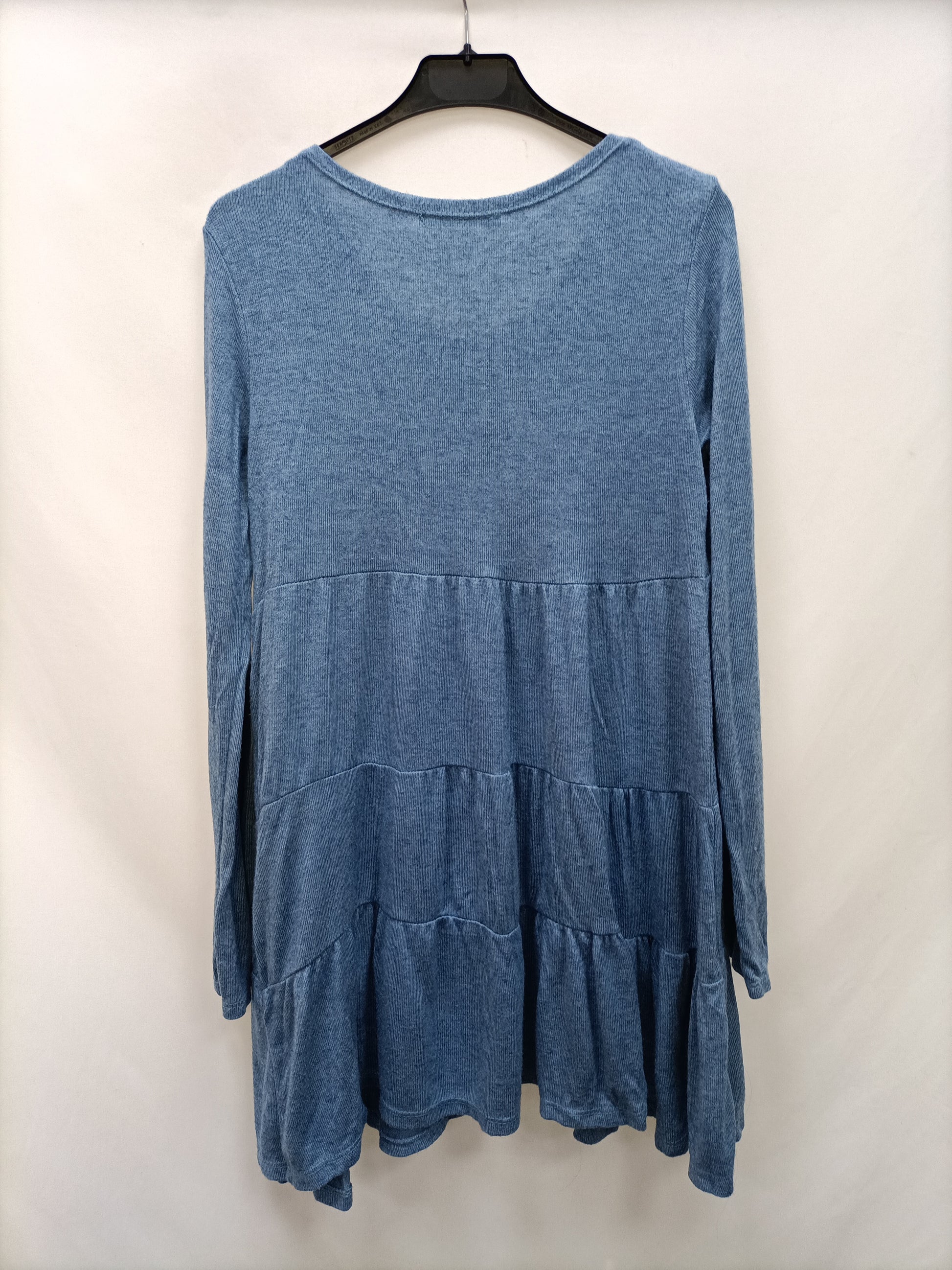 Short blue dress in flowing knit. Stretch fabric. Length 75 cm.