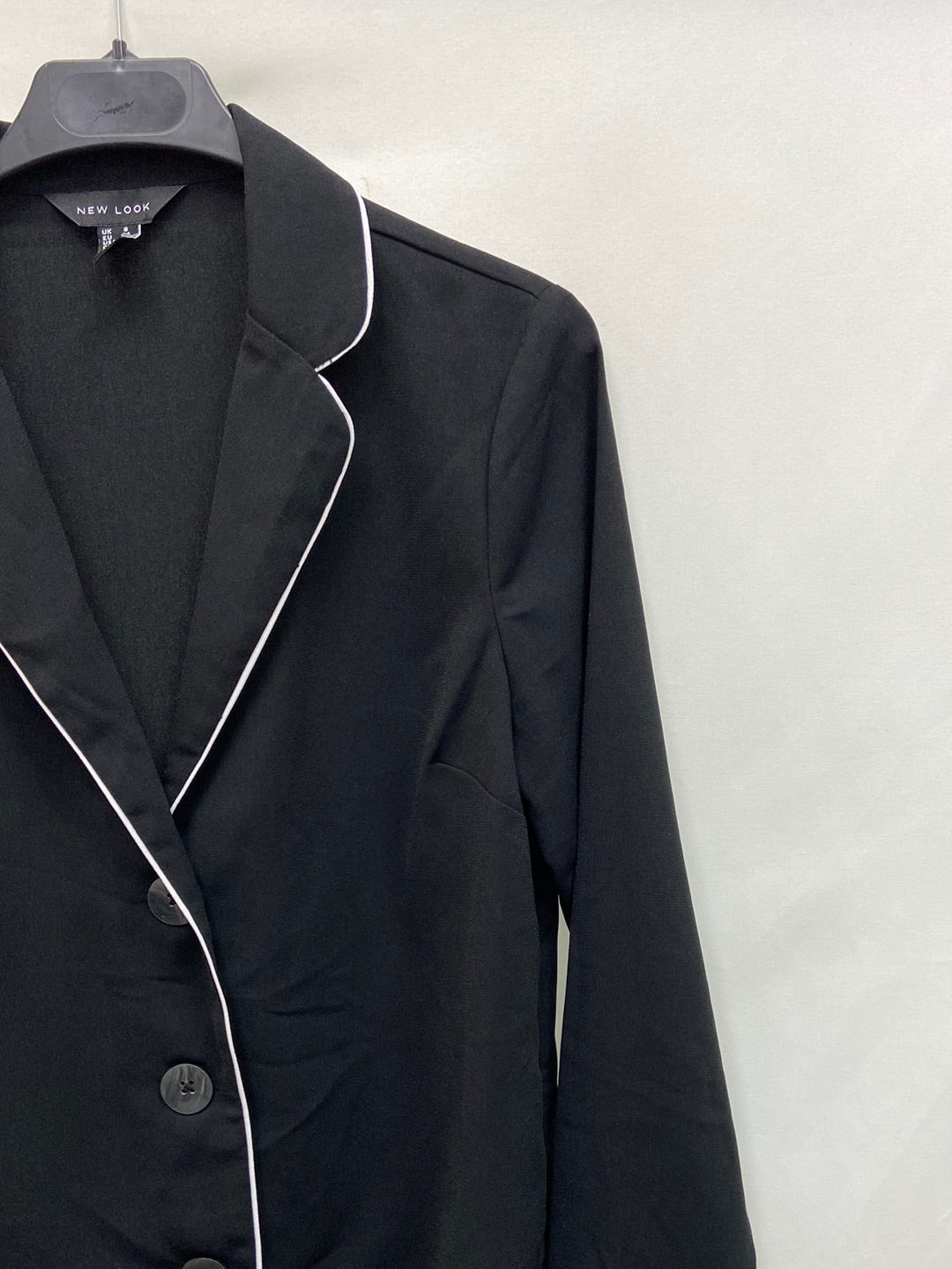 Black pajama-style shirt with buttons and white details. Armpit to armpit 43 cm, length 57 cm.