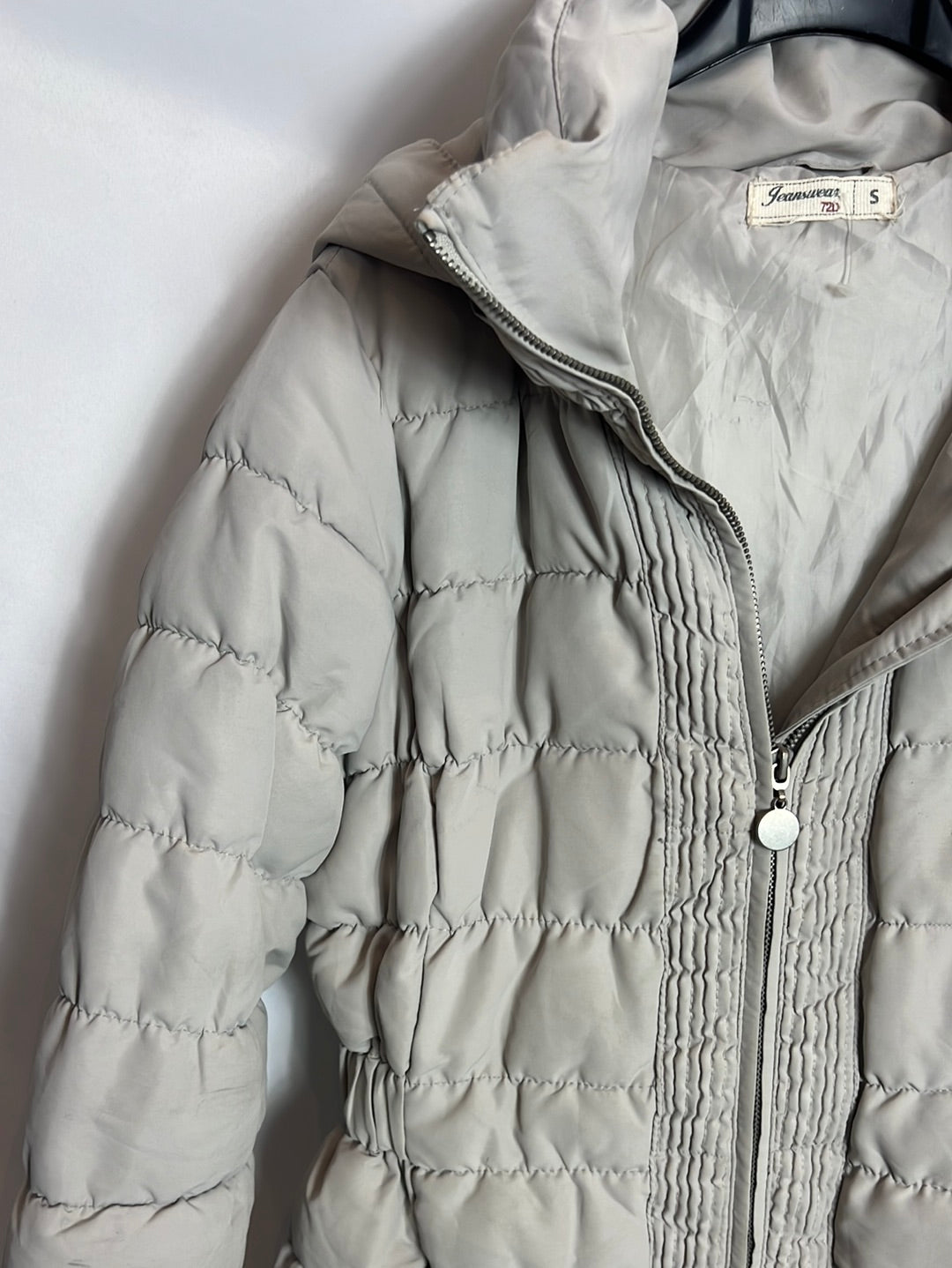 JEANSWEAR. Beige/gray feathers hood. TS (M)