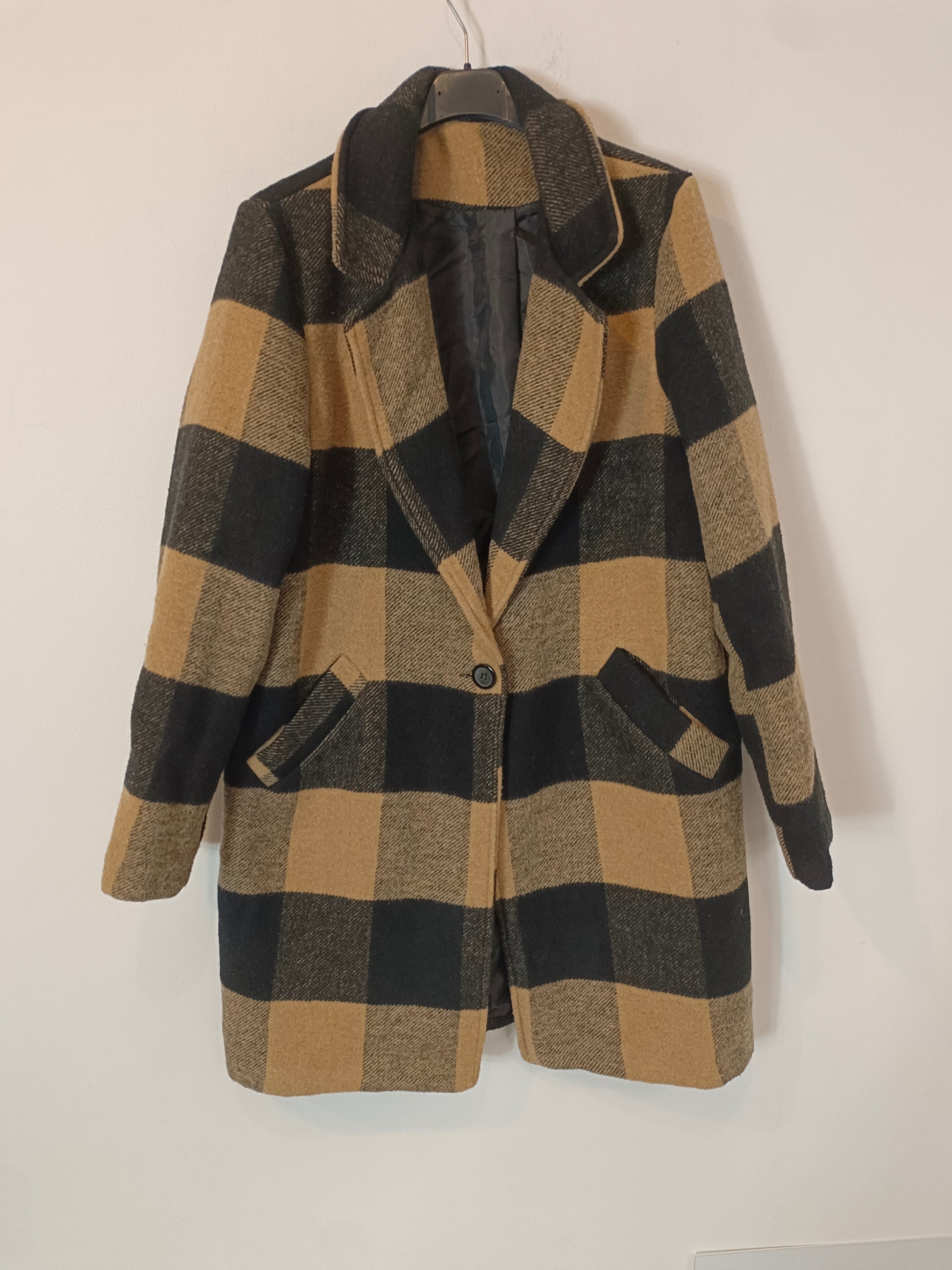 Camel and black checked cloth coat. Fastens with one button.