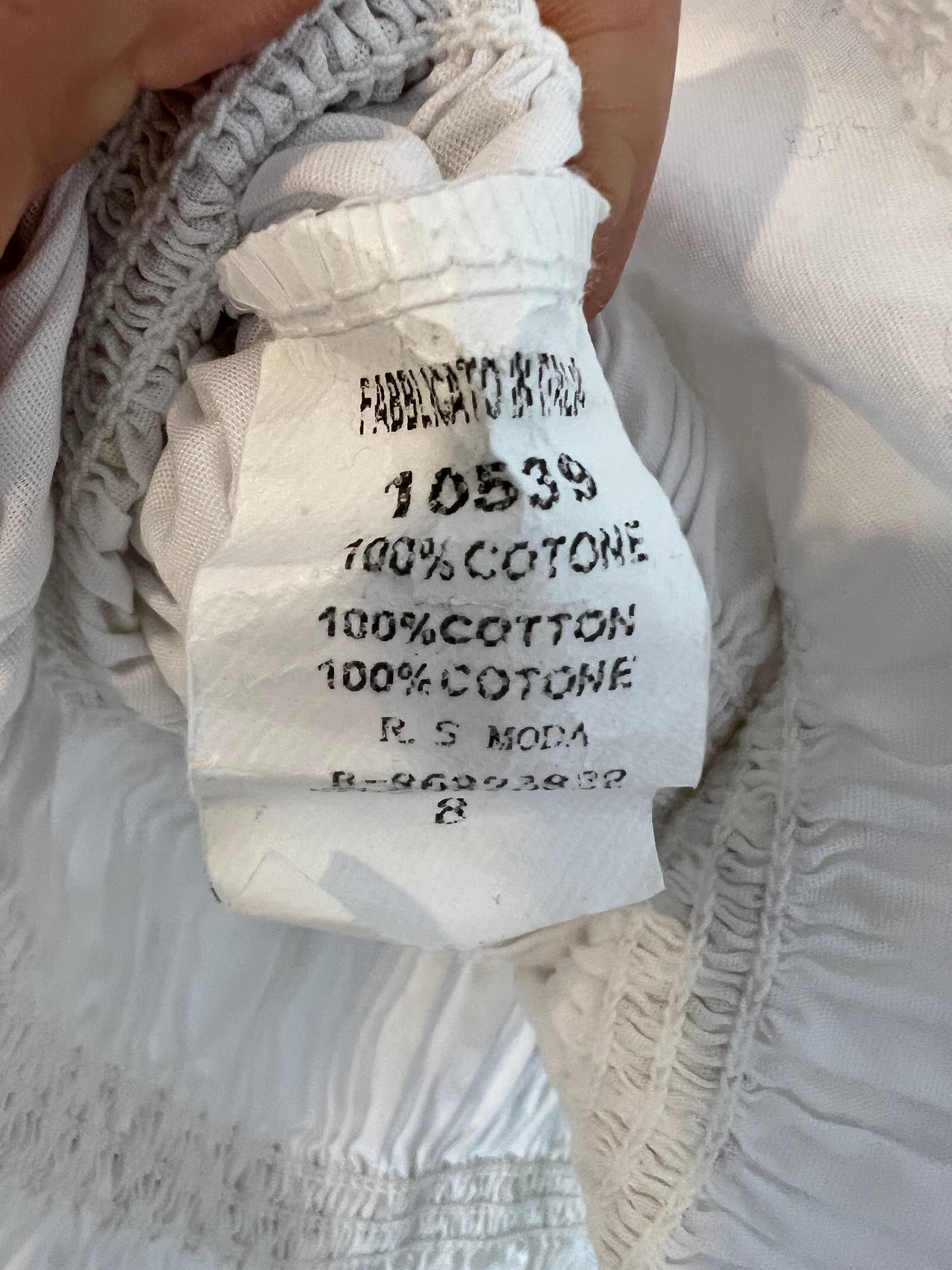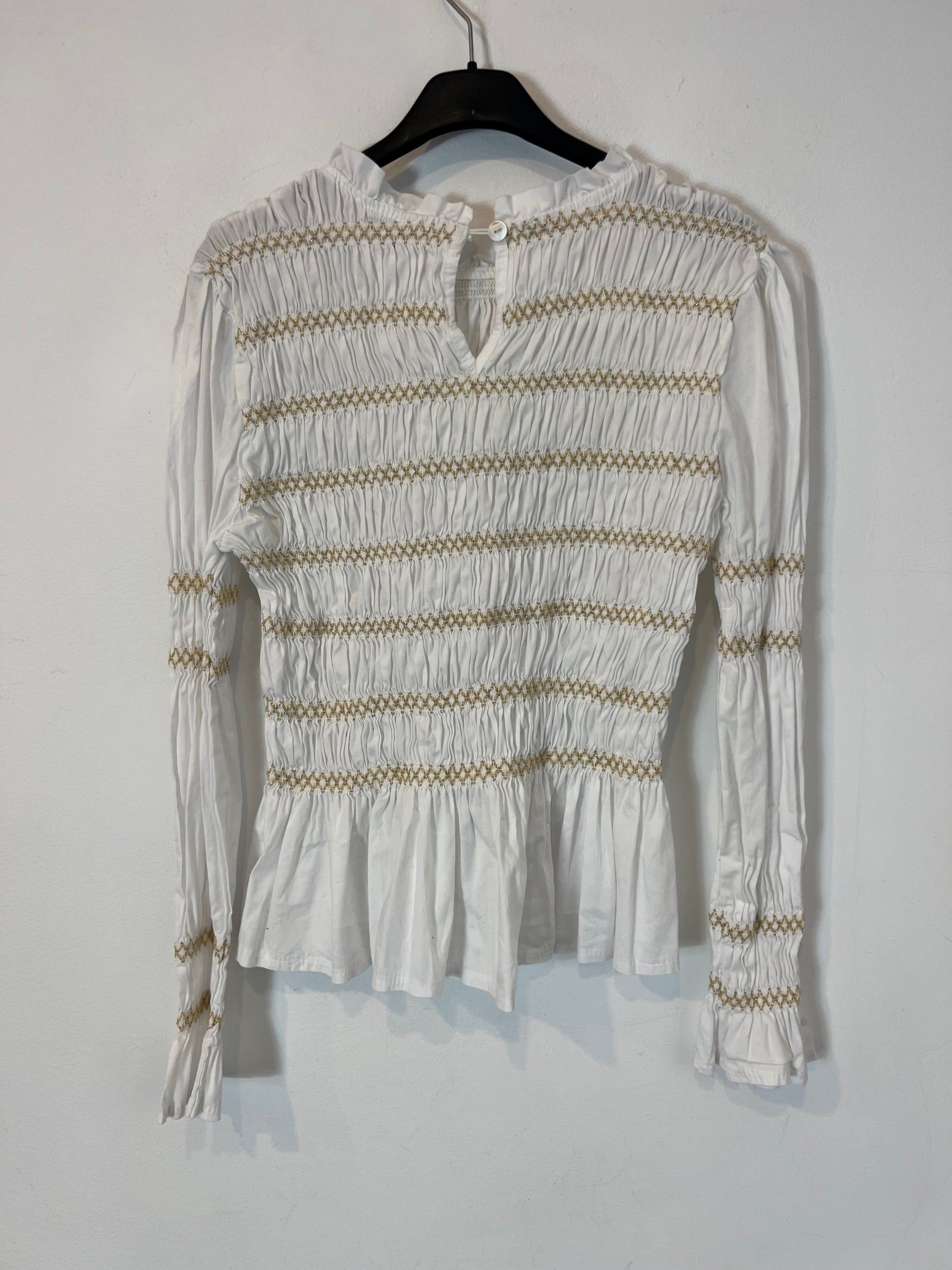 blusa blanca de nido de abeja elástica con detalles en dorado.