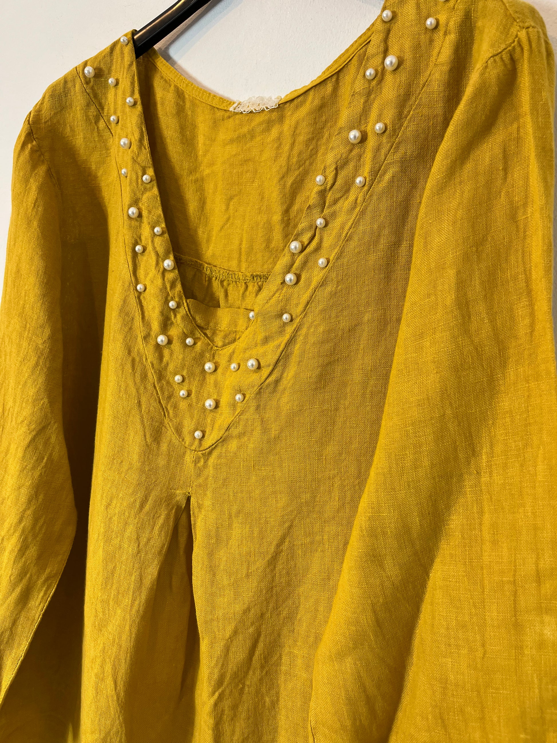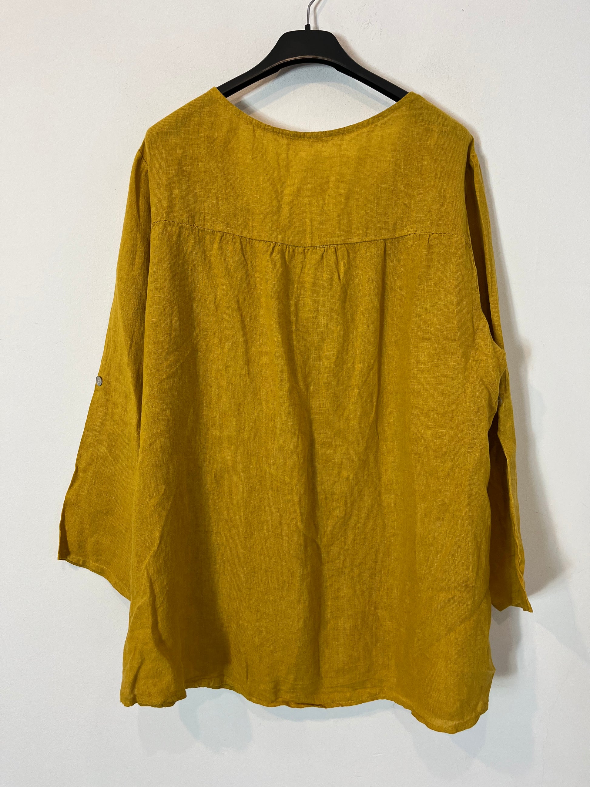 Mustard linen blouse with neckline detail. Back 57 cm, length 73 cm.