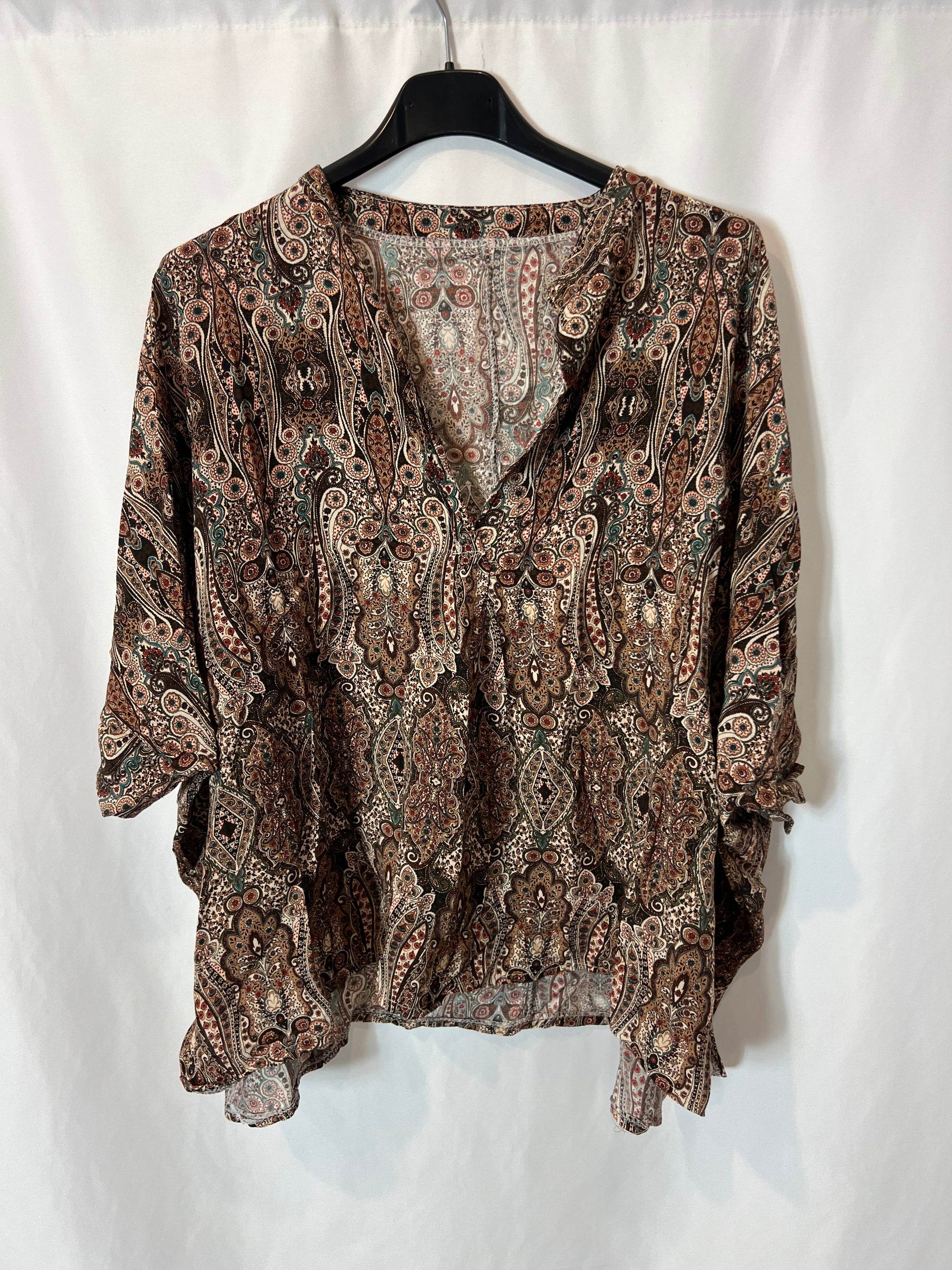 Flowy blouse with batwing sleeves and a brown amoeba print. 58cm long.