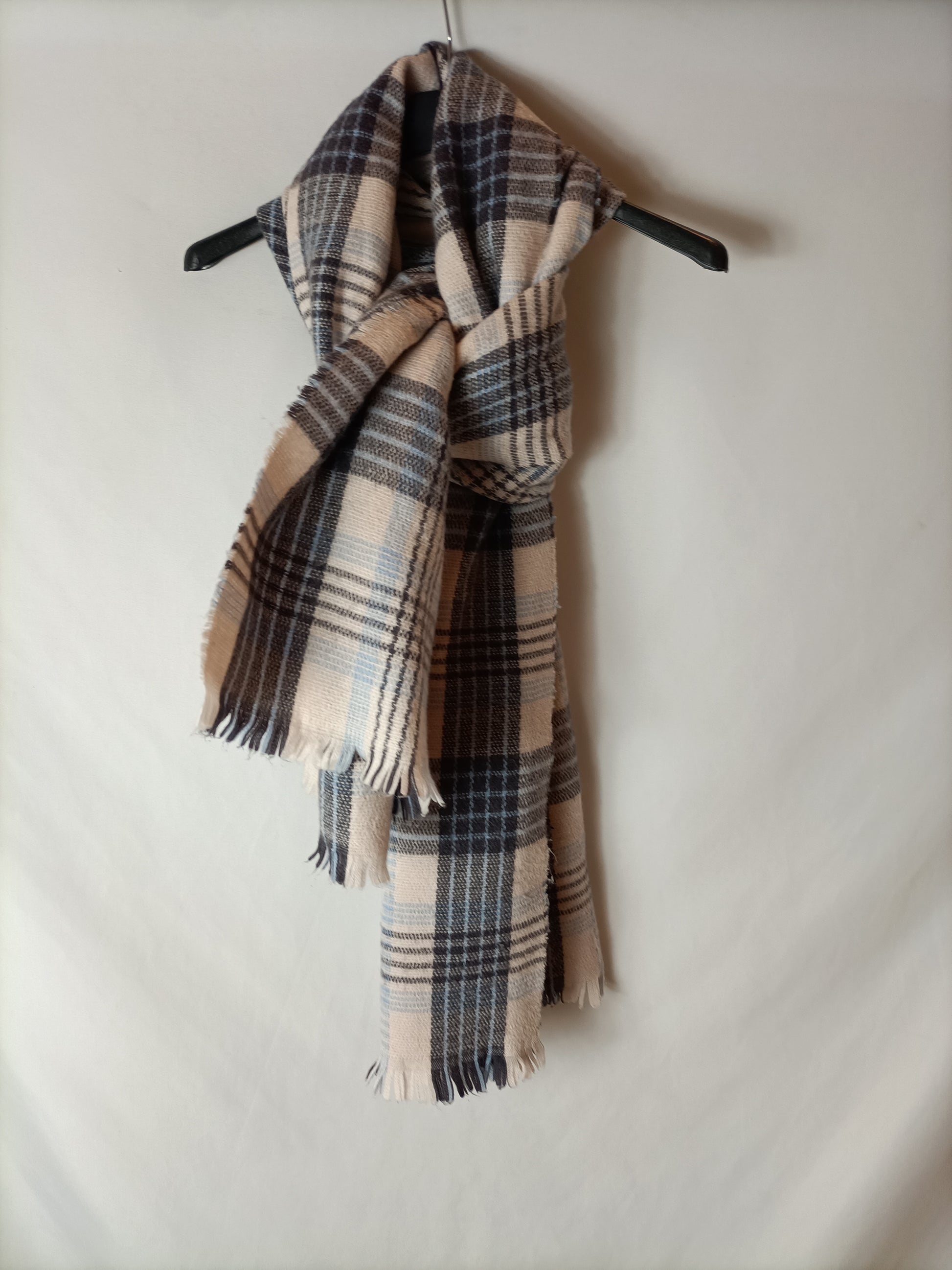 Brown and light blue checkered scarf.