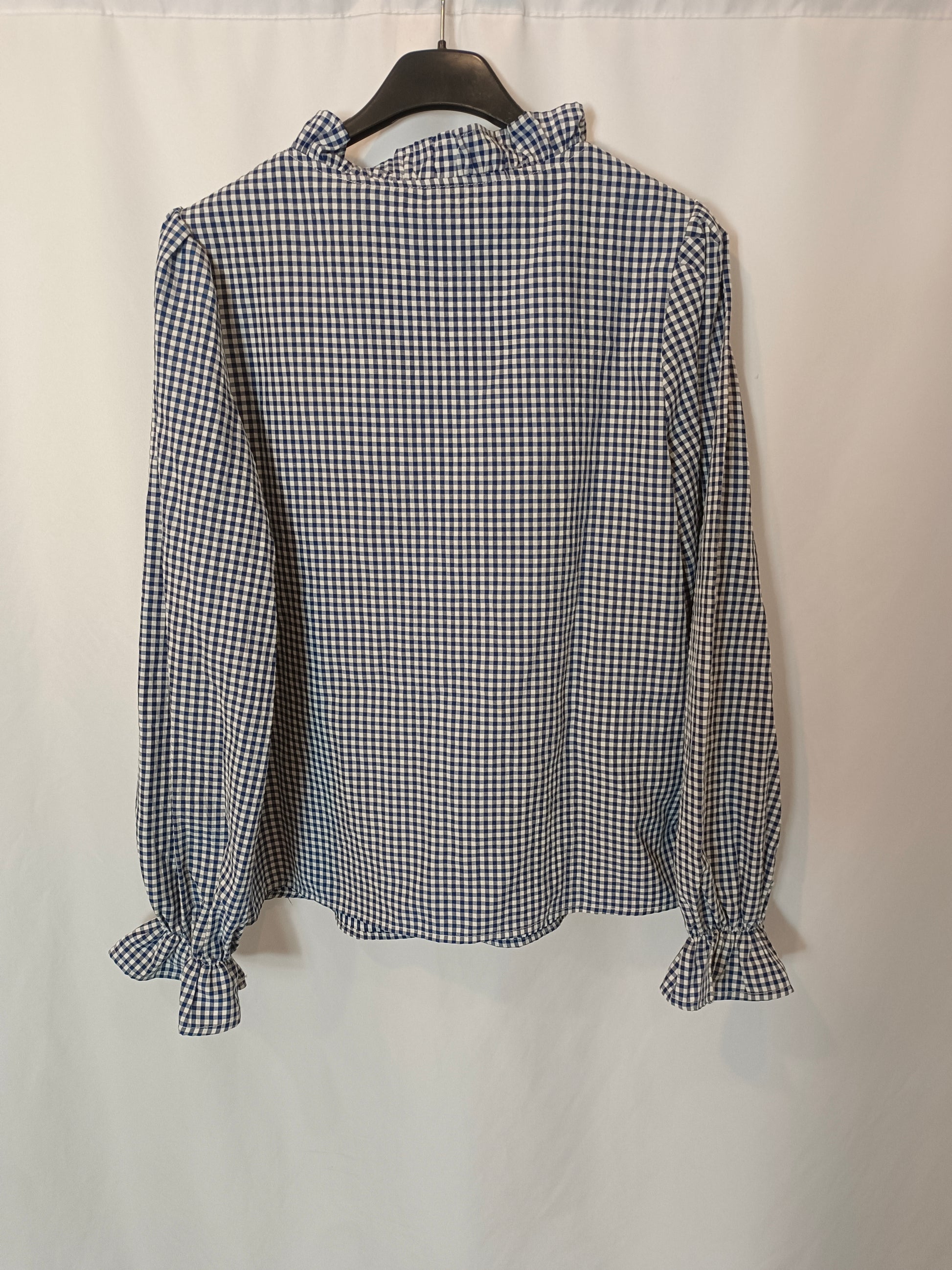 Flowy blue and white gingham shirt with ruffle. Back 34 cm, length 58 cm.