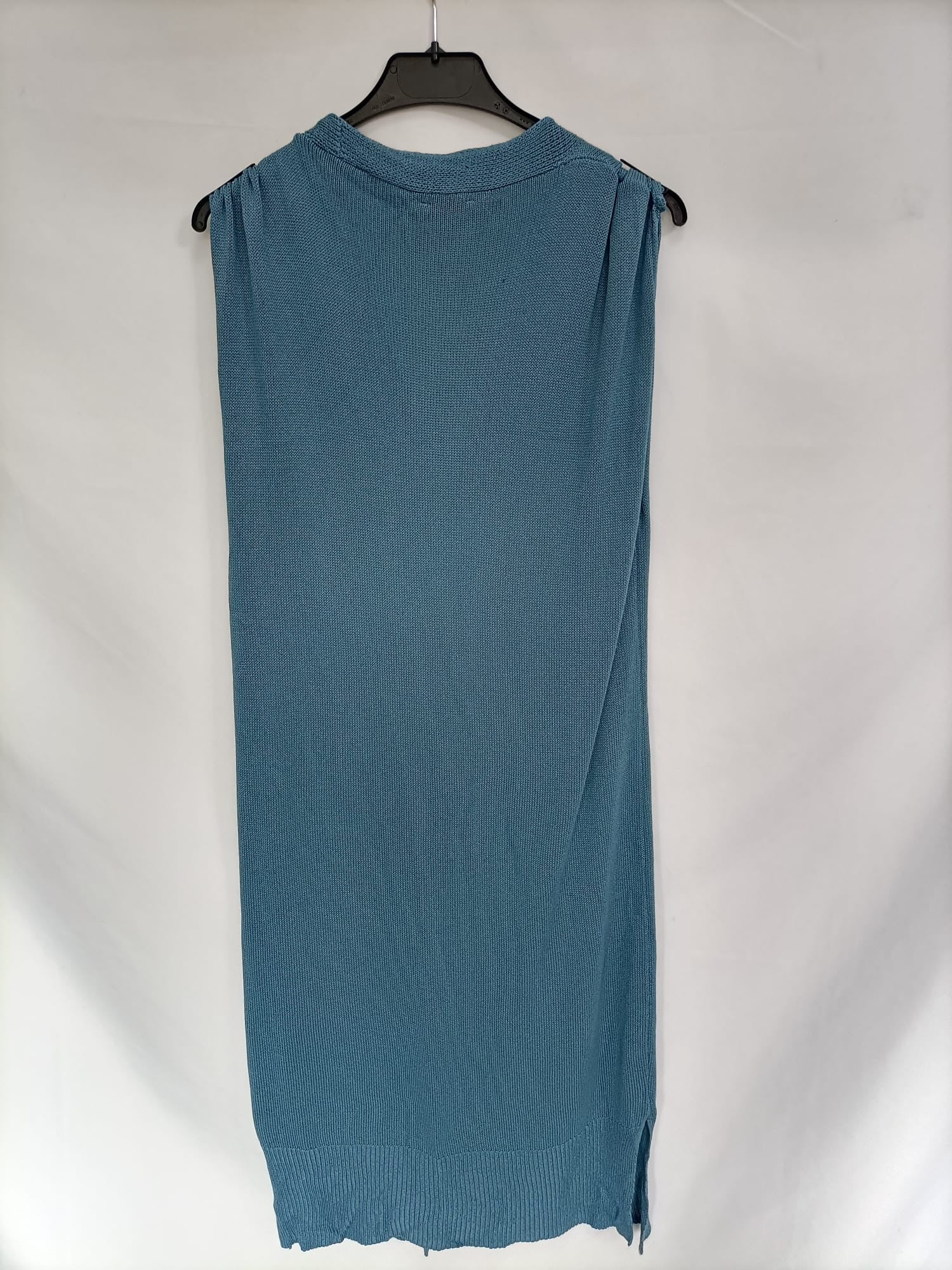 Blue buttoned knit vest. Elastic. Length 110 cm.