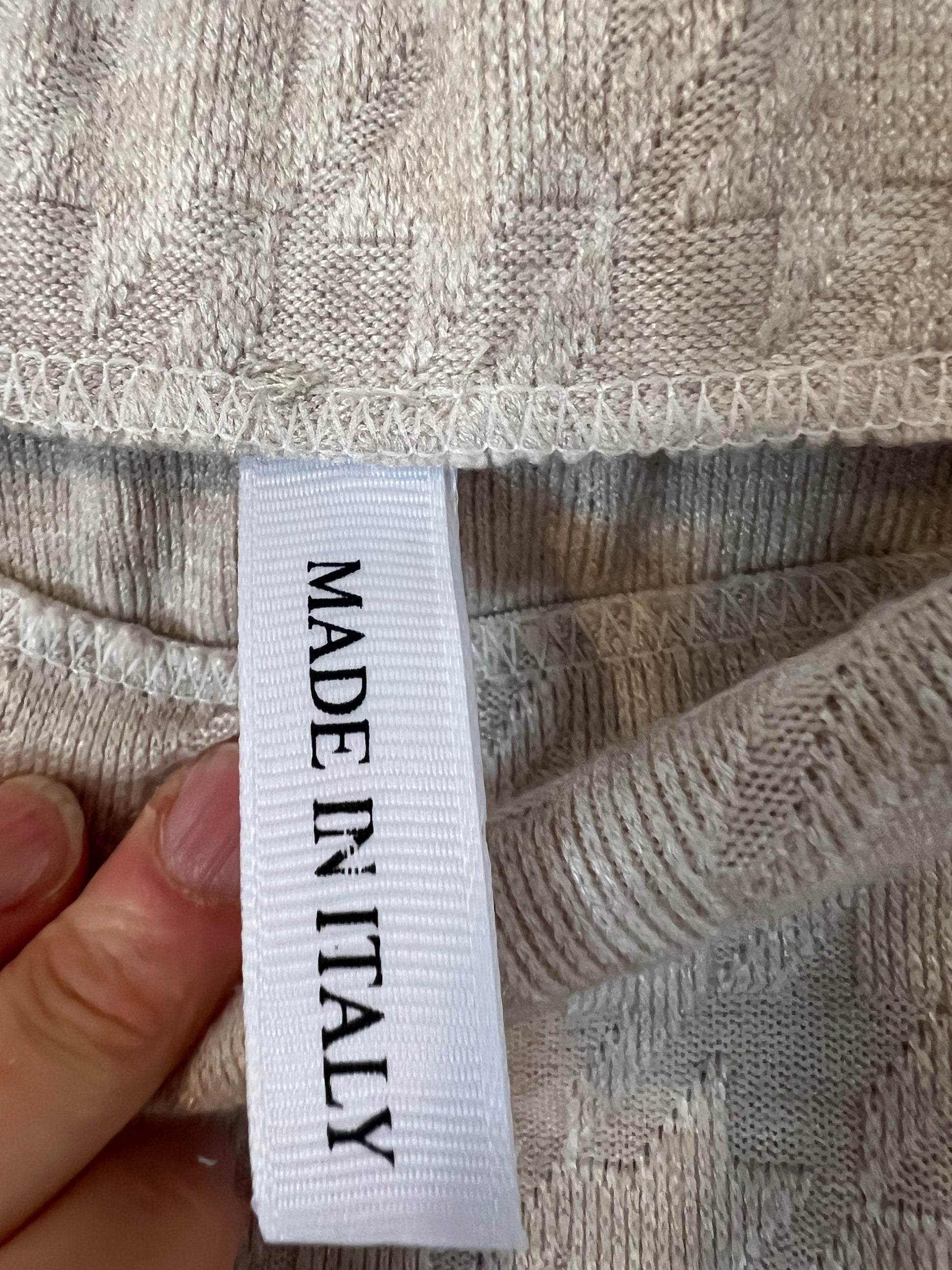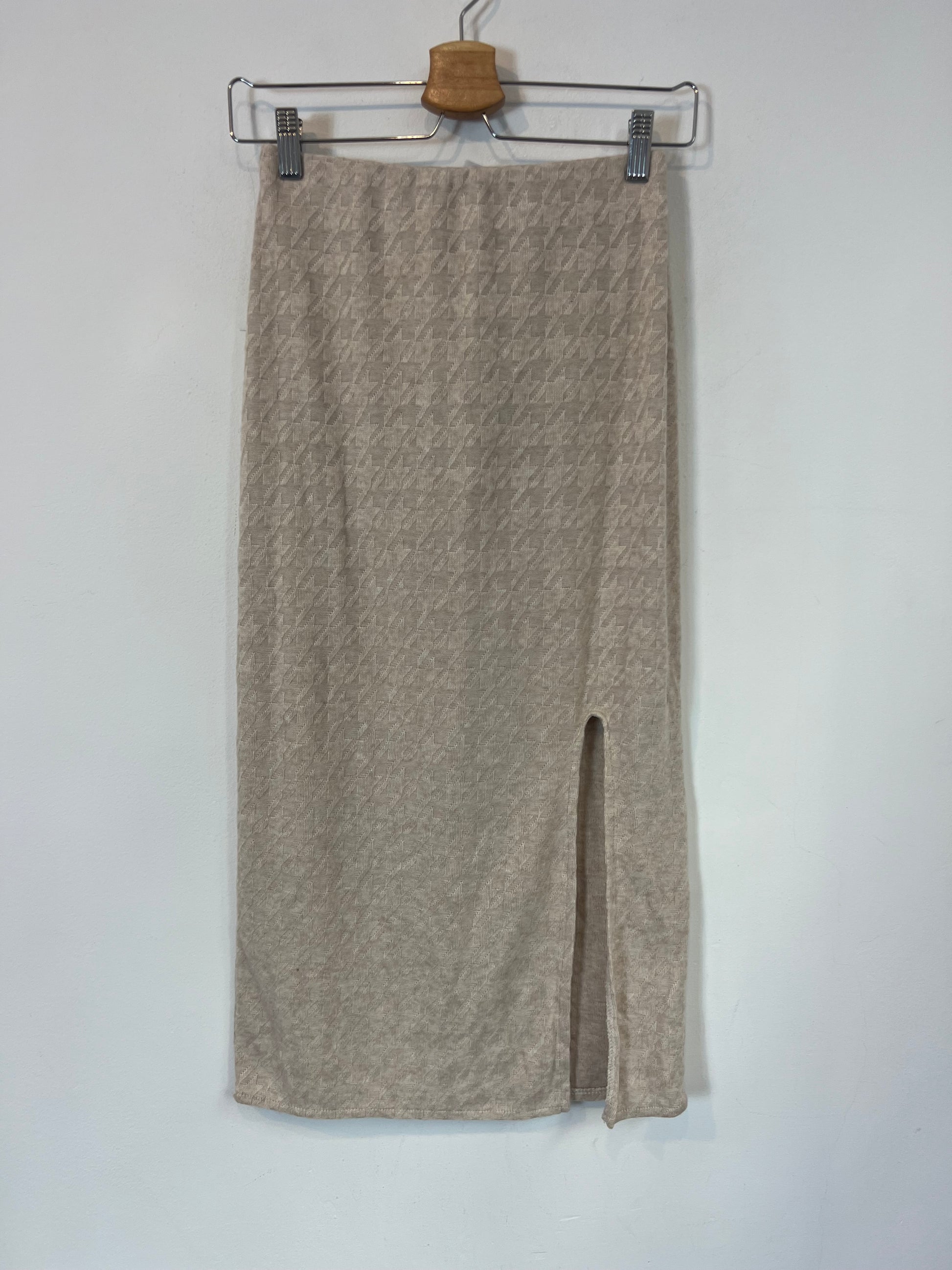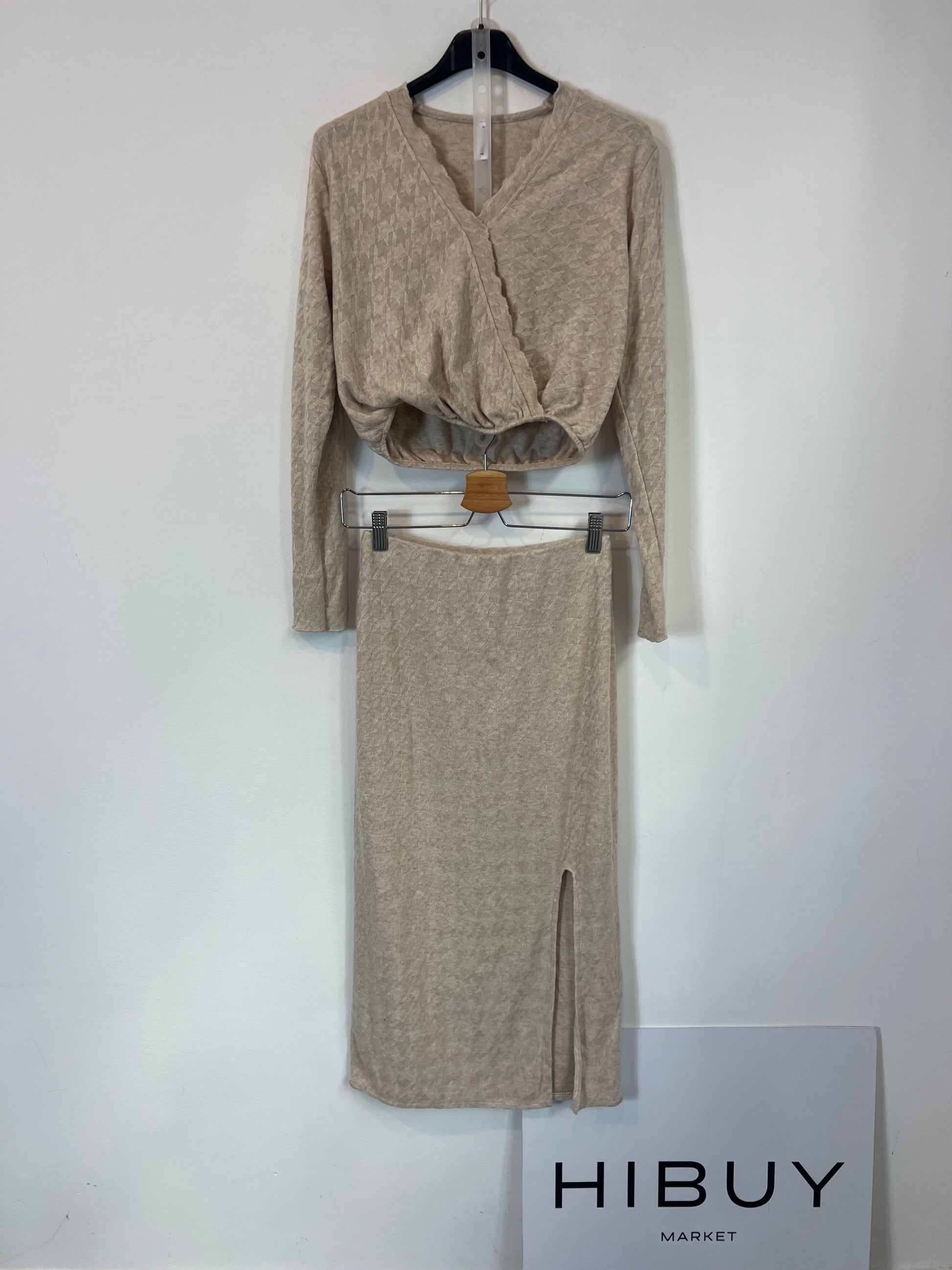 Beige houndstooth knit skirt and wrap top set. Elastic waist.