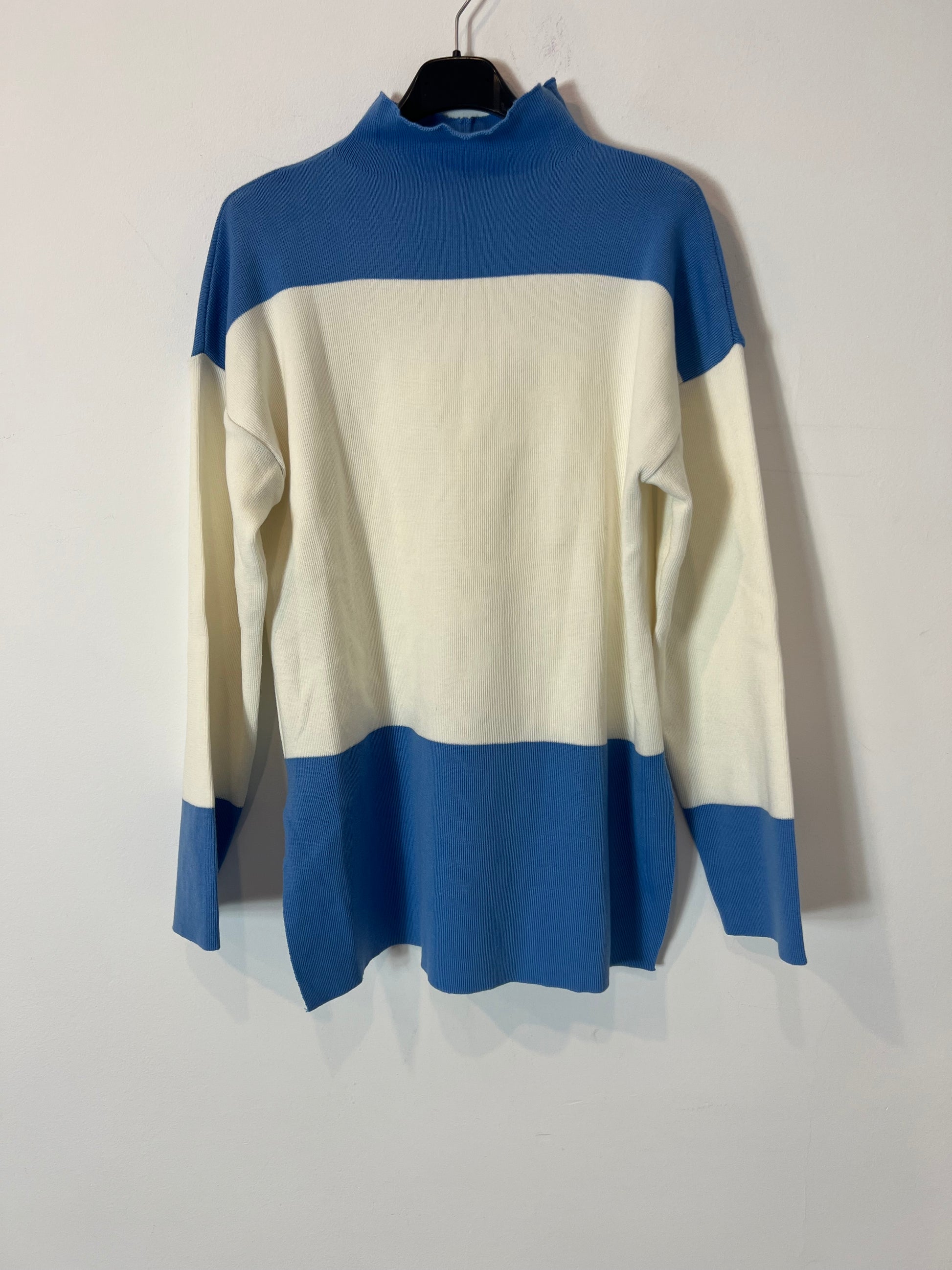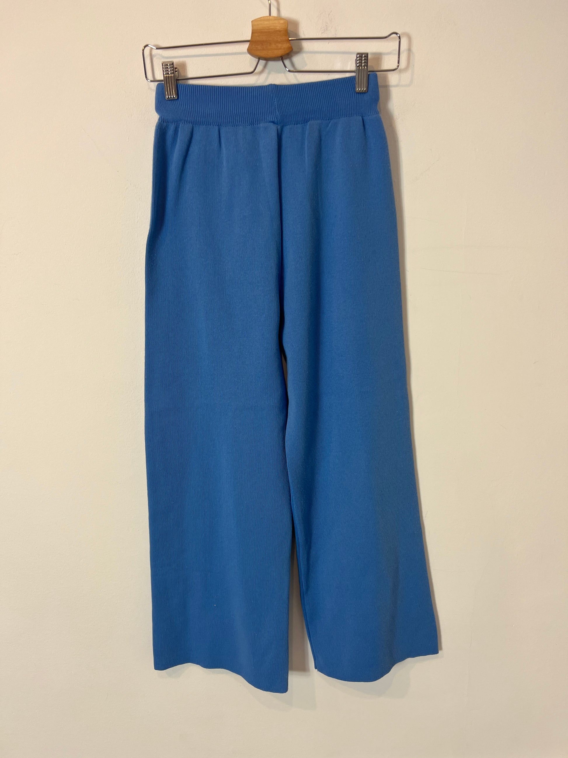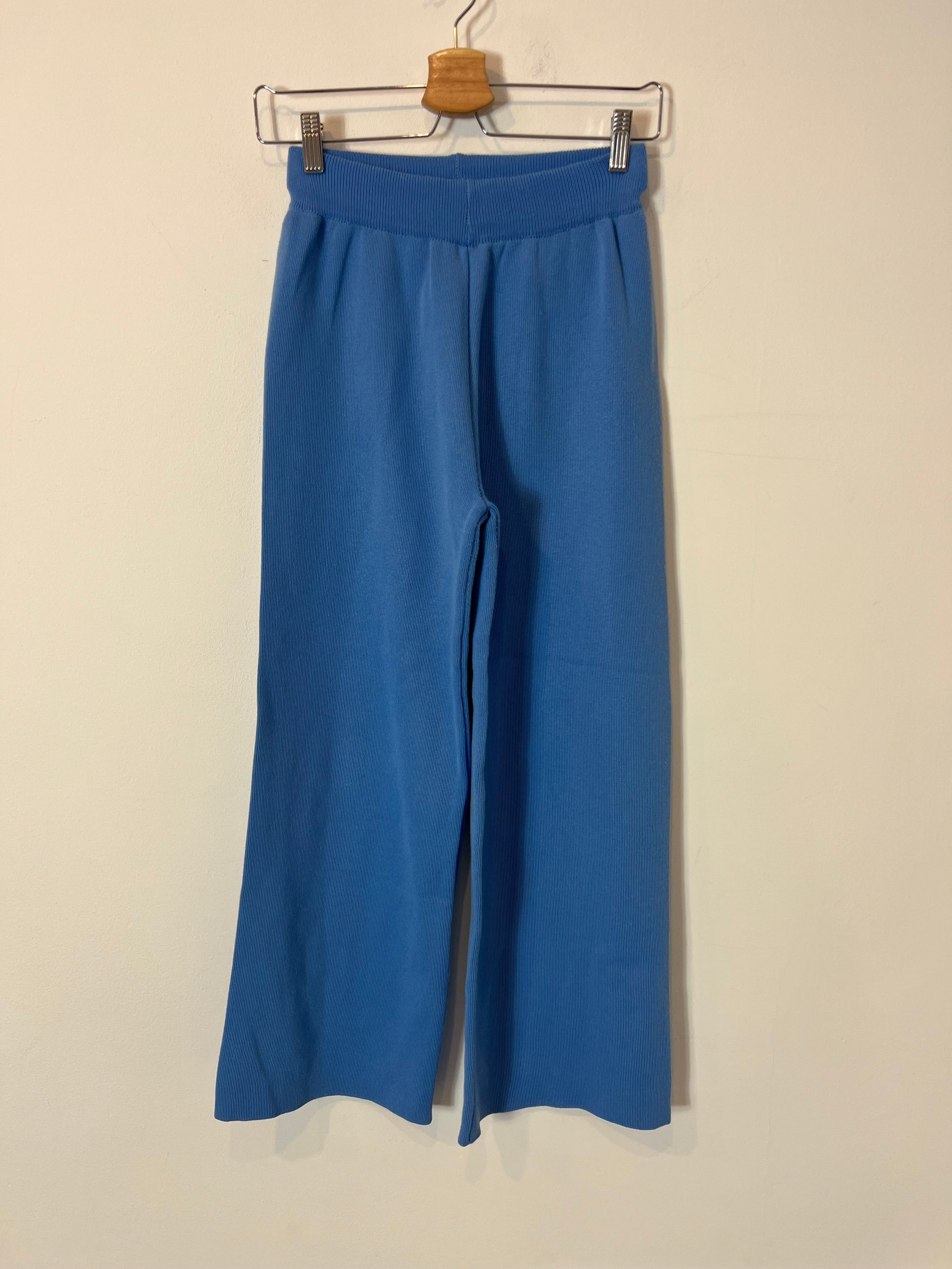 Conjunto punto bicolor azul claro y blanco. Pantalón cintura elástica 32cm, largo 94cm. Jersey: de sisa a sisa 54cm, largo delantero 63cm