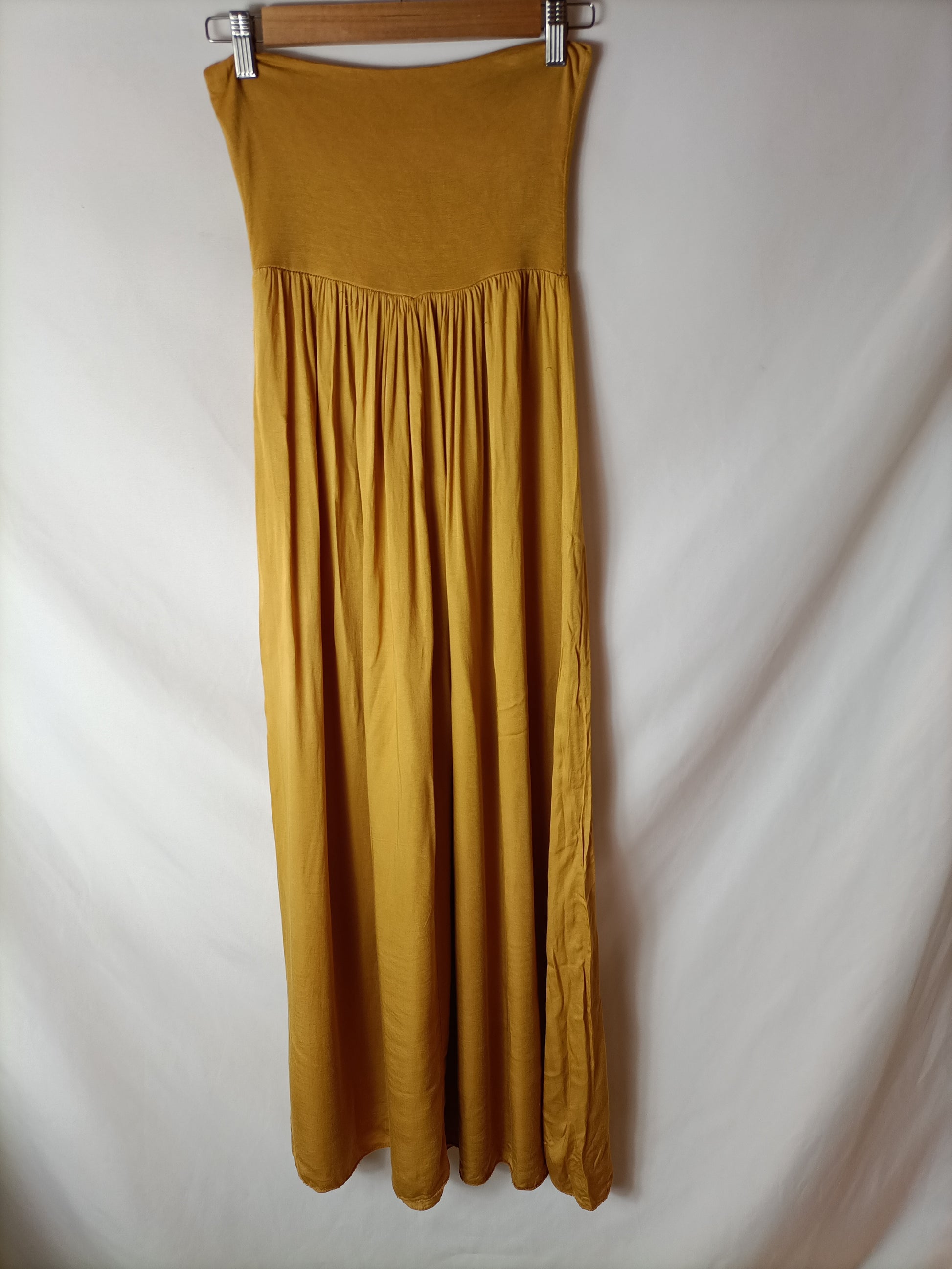 Long, flowing mustard skirt with fitted, adjustable elastic waistband.