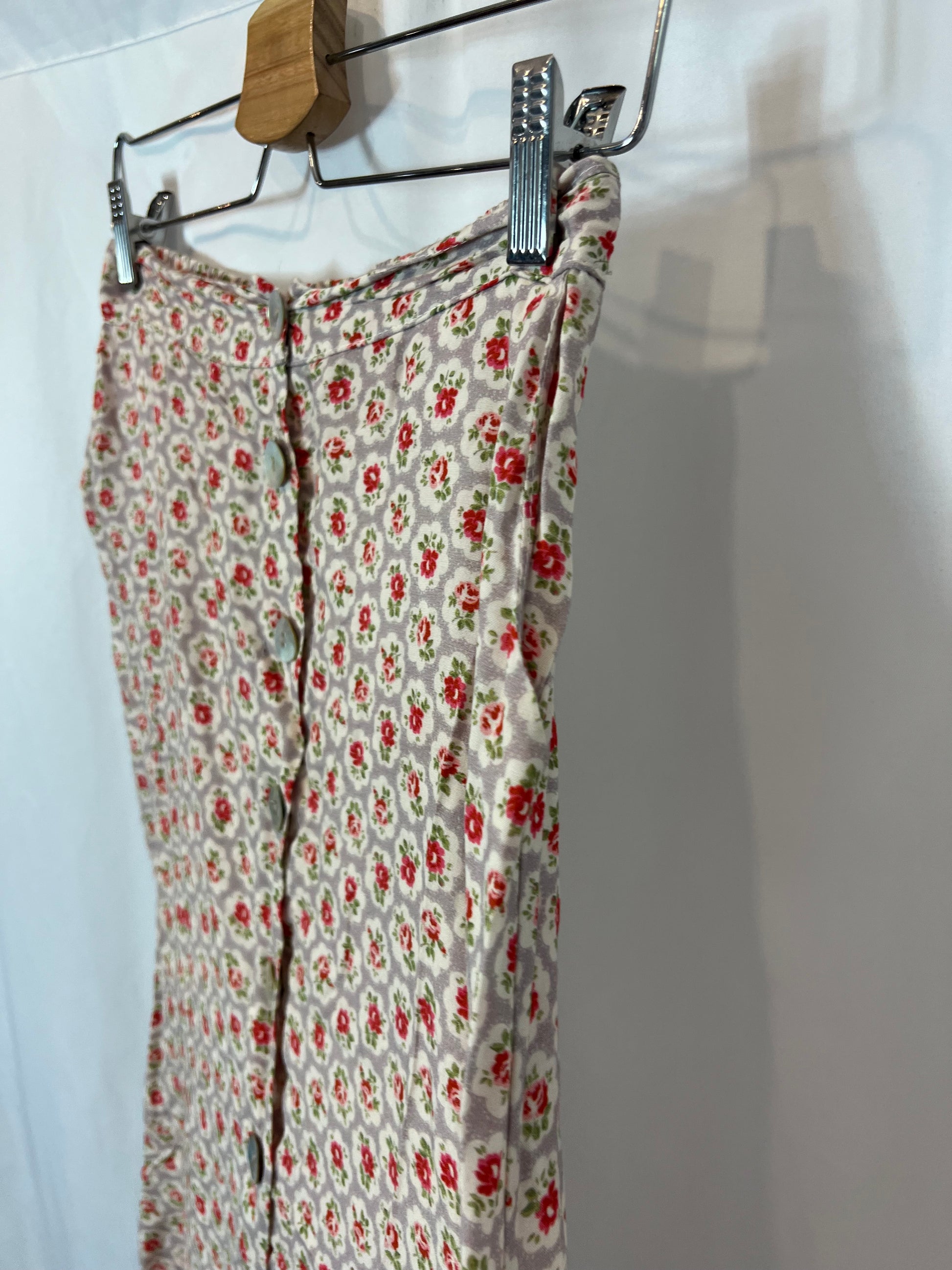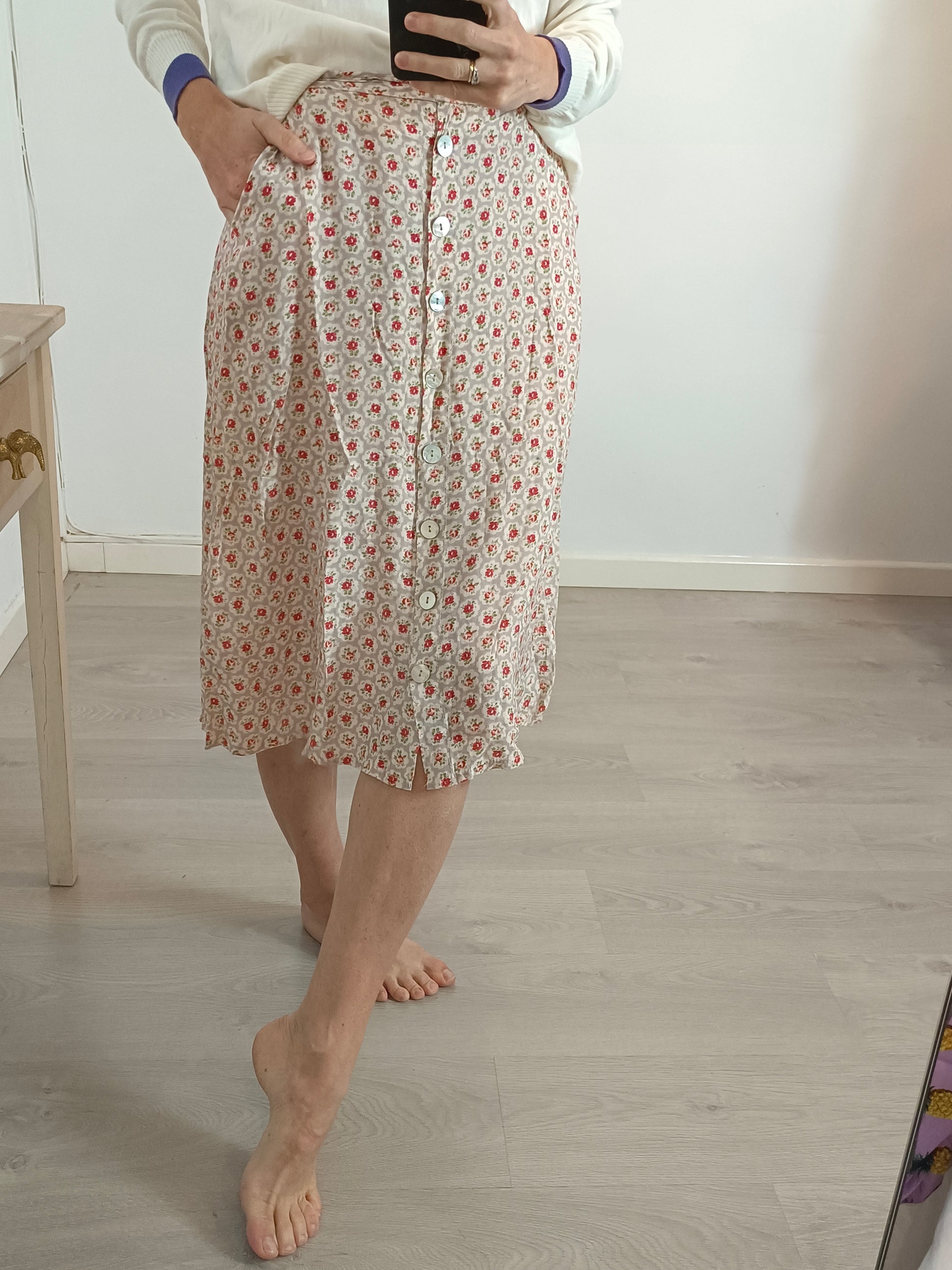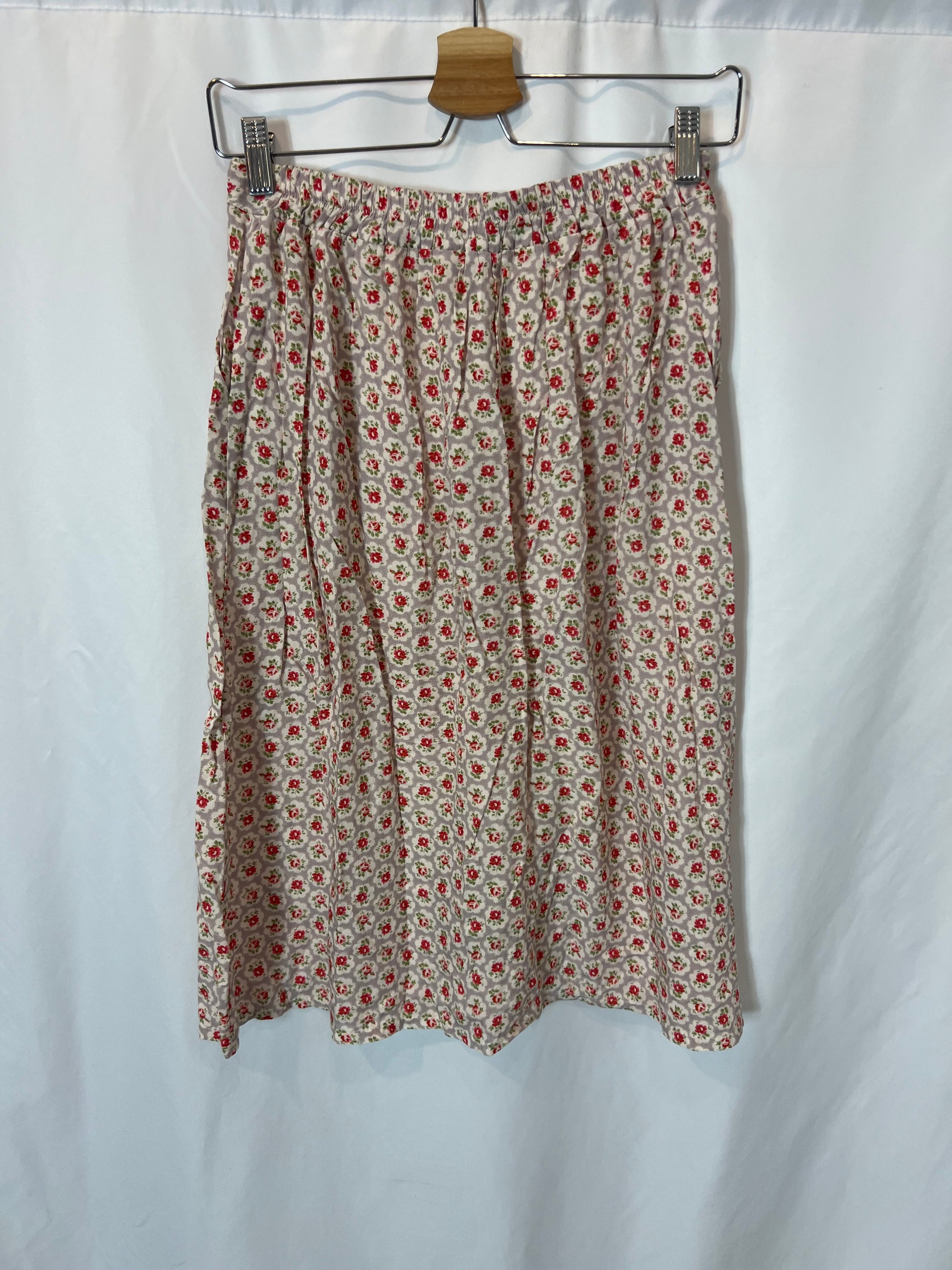 falda corta/midi malva con estampado de flores abotonados. Cintira 35cm, largo 61cm
