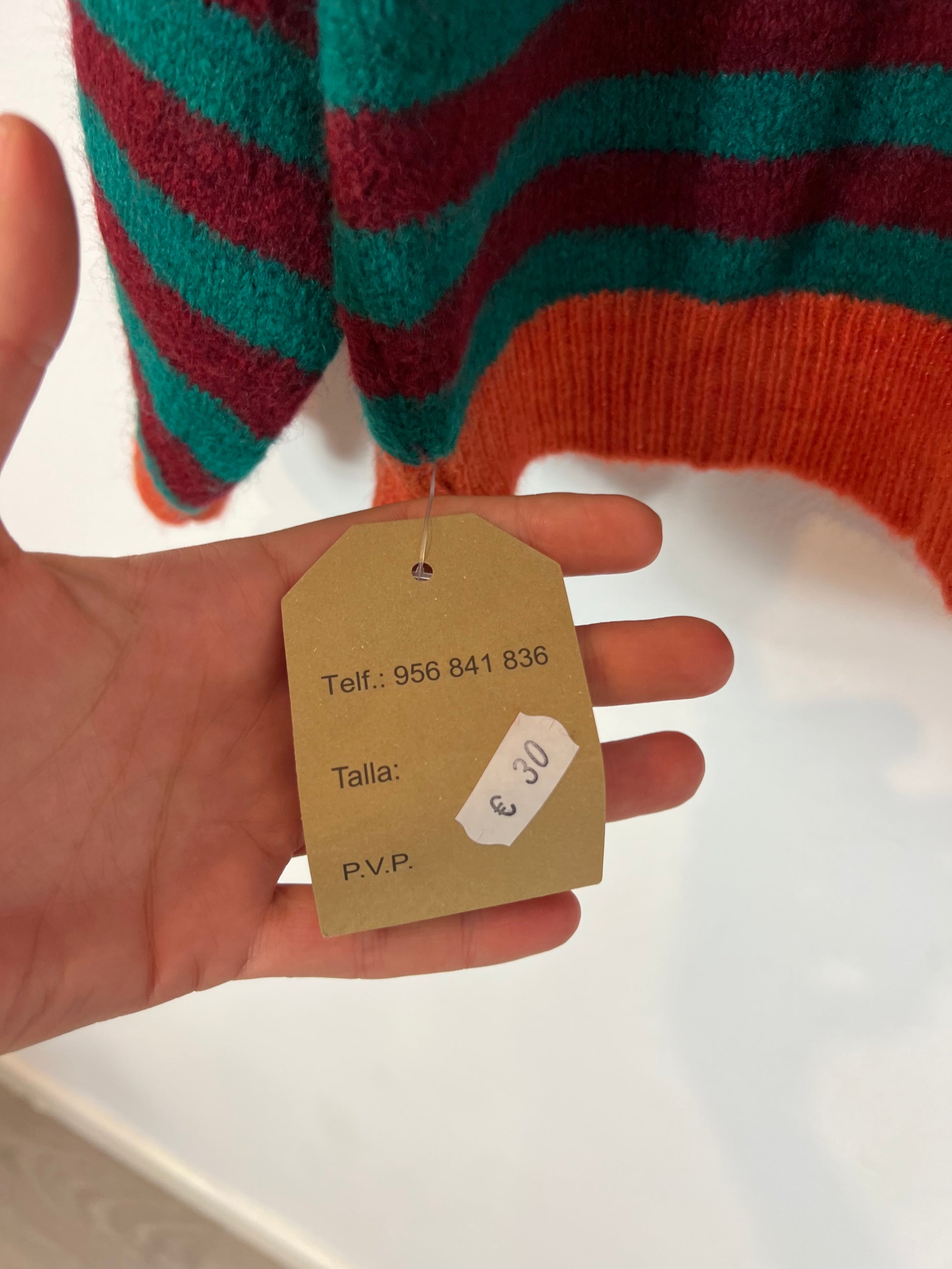 NEW WITH TAG. Green and burgundy striped sweater with orange details.