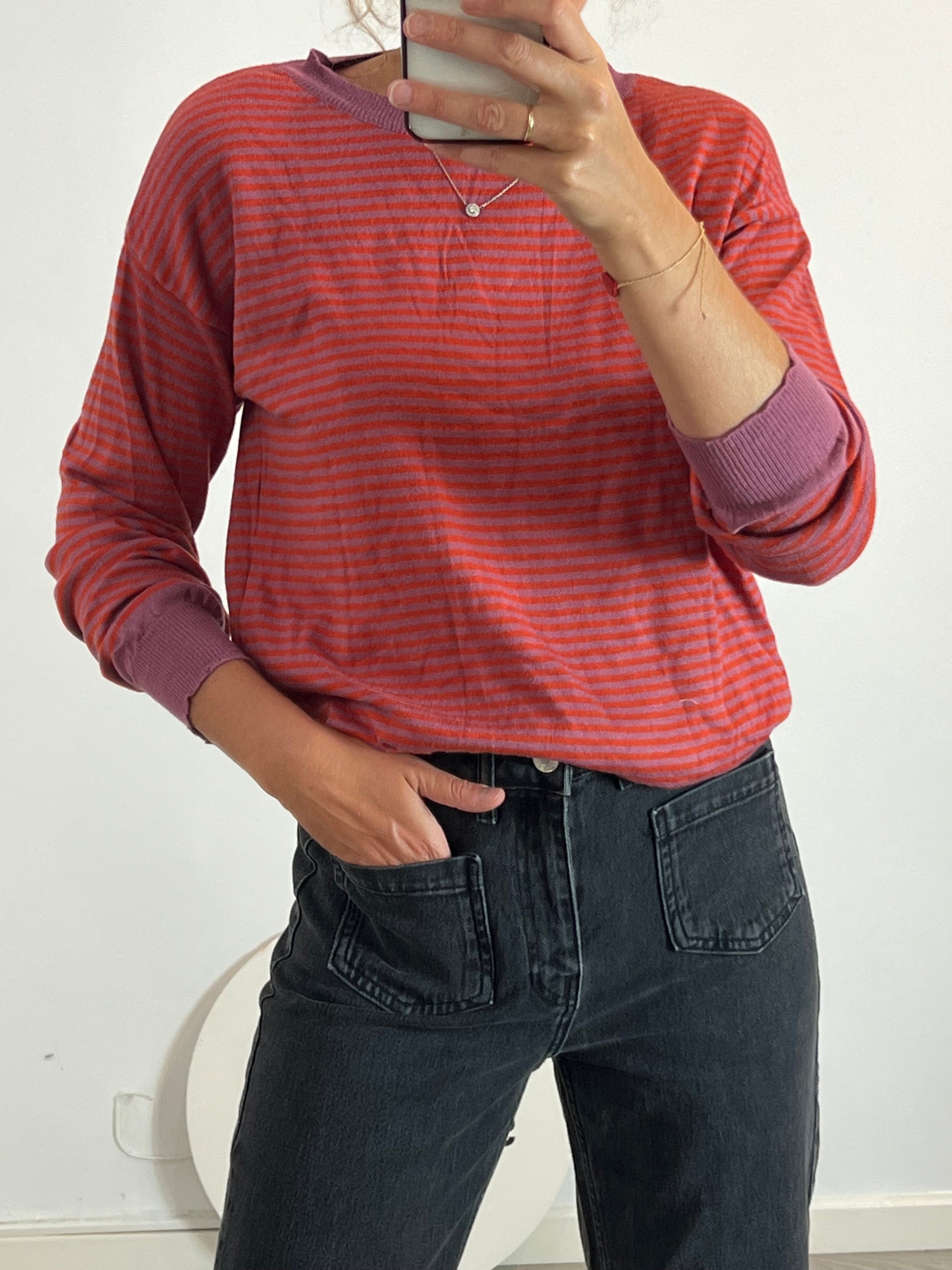 Jersey fino y fluido de rayas moradas y rojas. Largo 65cm