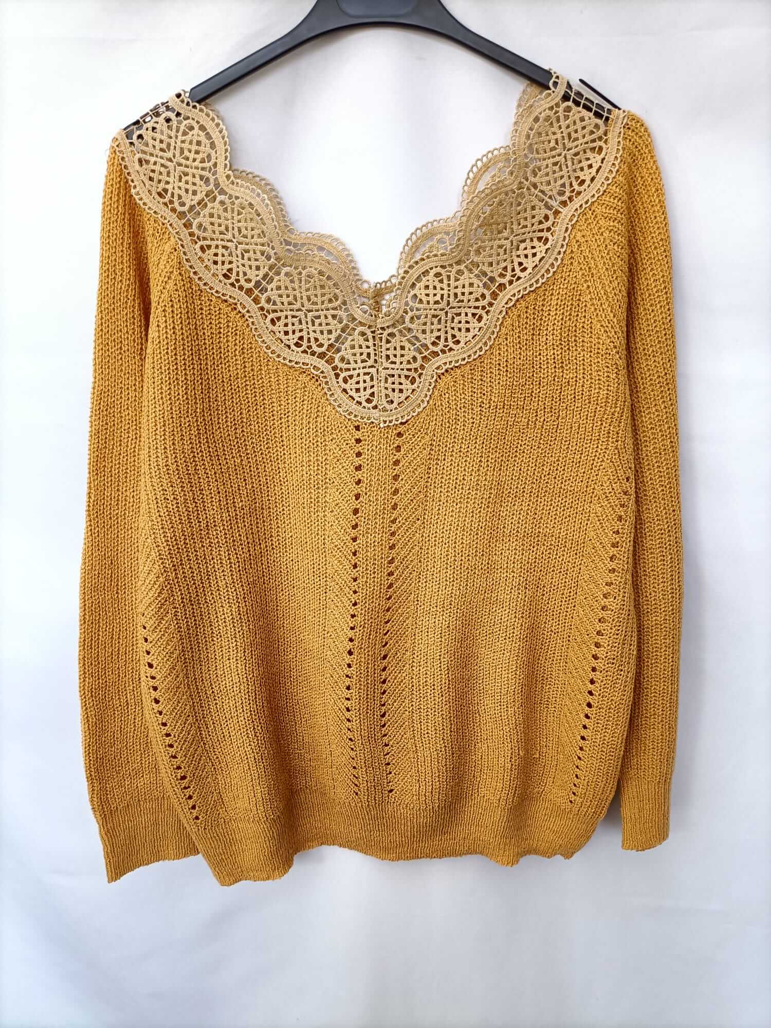 Otras. M/L. Jersey de punto mostaza con detalle de encaje en el cuello. Elastico. Largo 66 cm