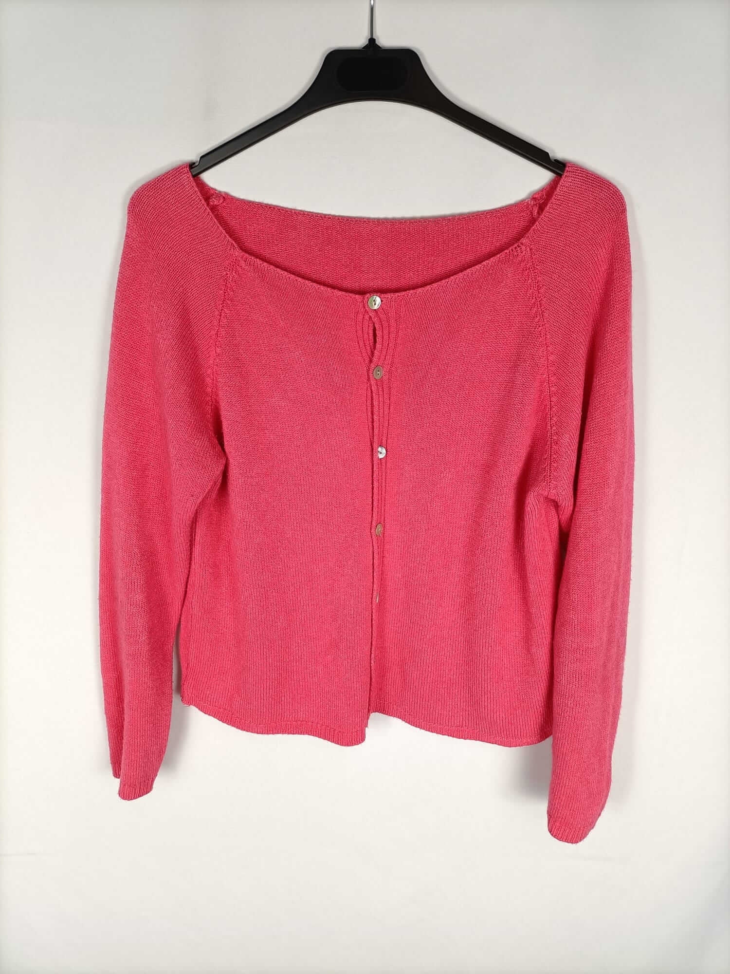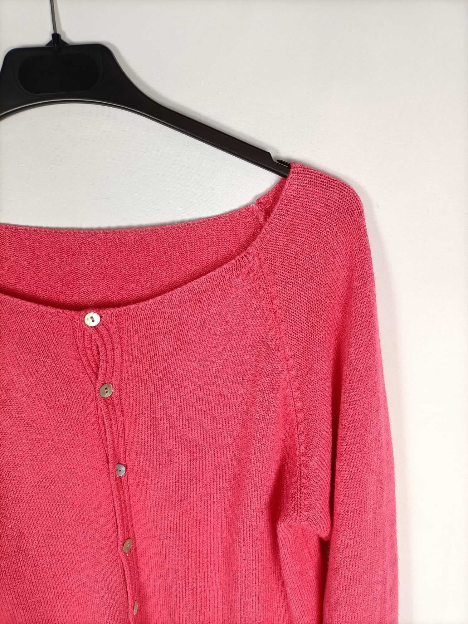Others. Short pink summer knit cardigan. Can be worn with buttons facing forward or backward. Stretchy. Length 45 cm.