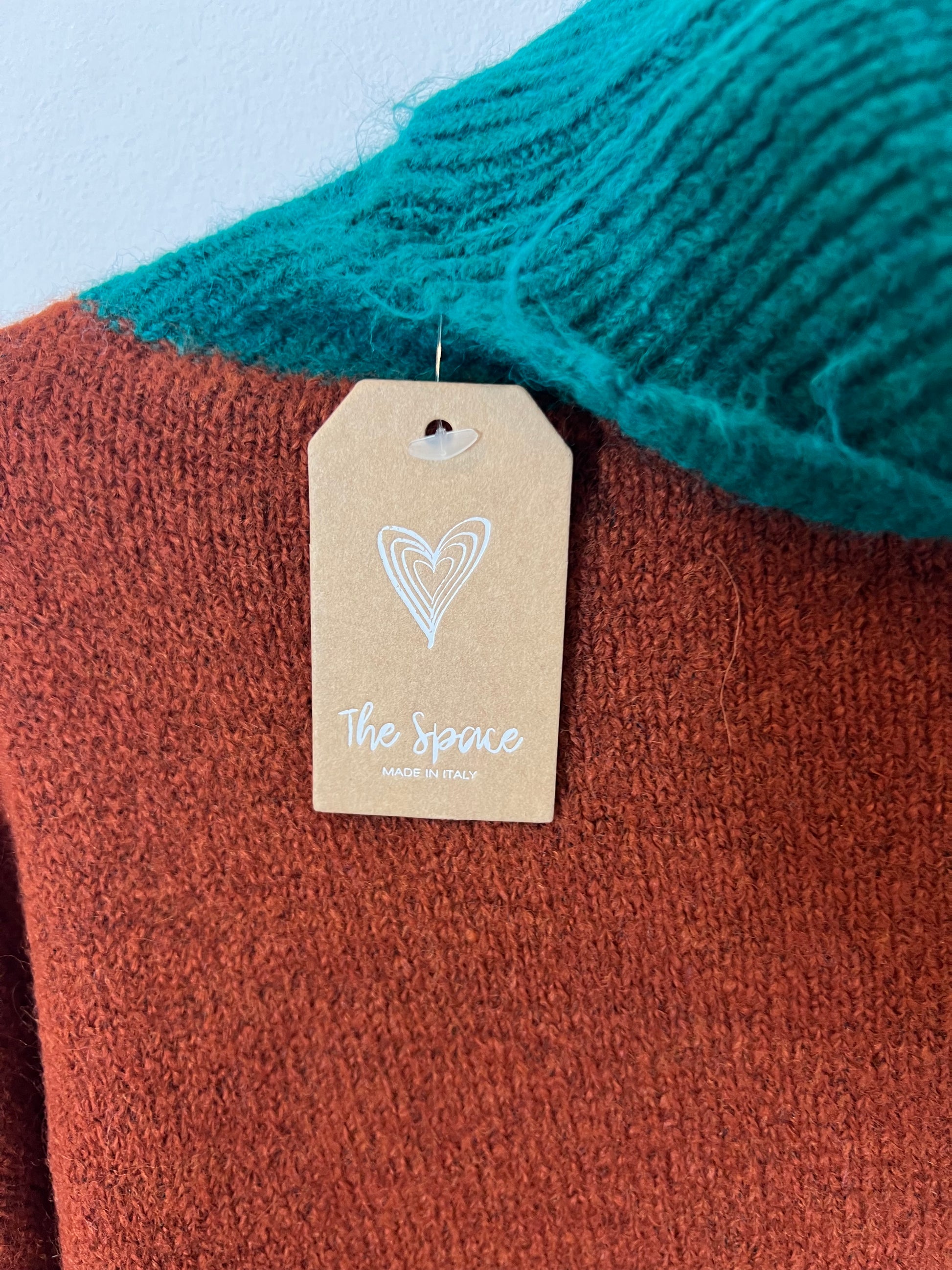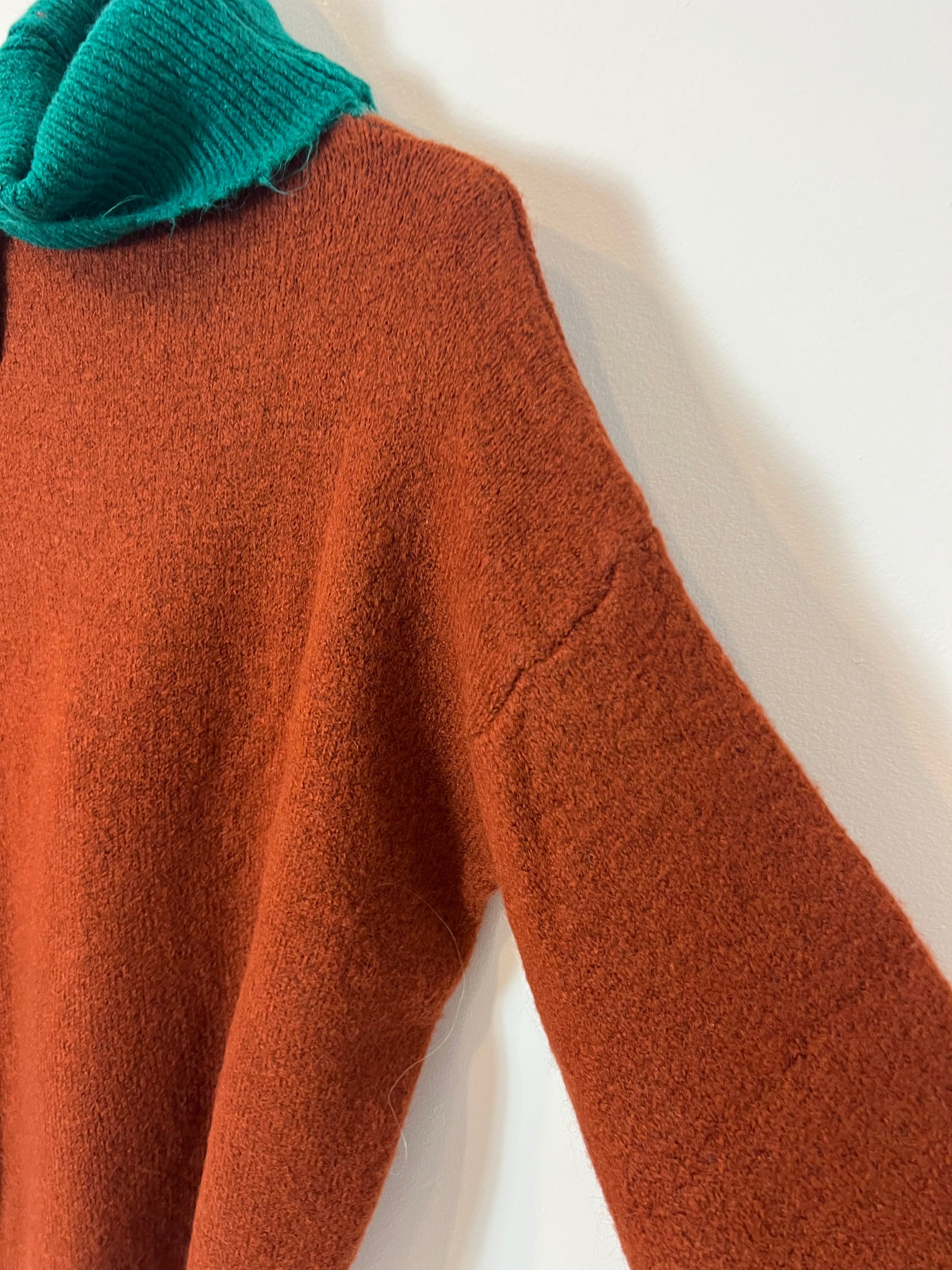 NEW WITH TAG. Green turtleneck sweater with blue sleeves and blue trim.
