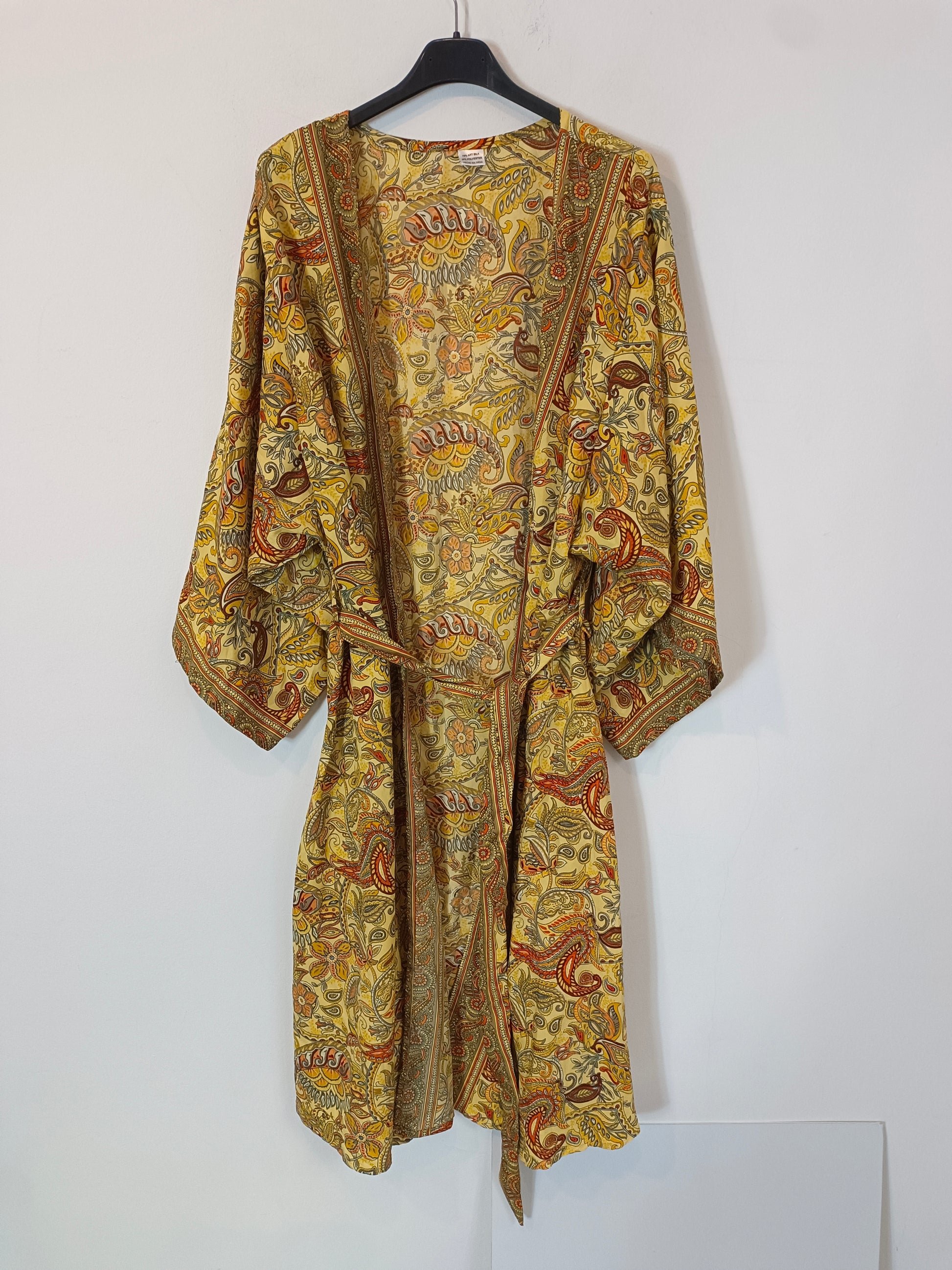 Flowing yellow kimono with amoeba print. Belted. Flowing and 70% silk.