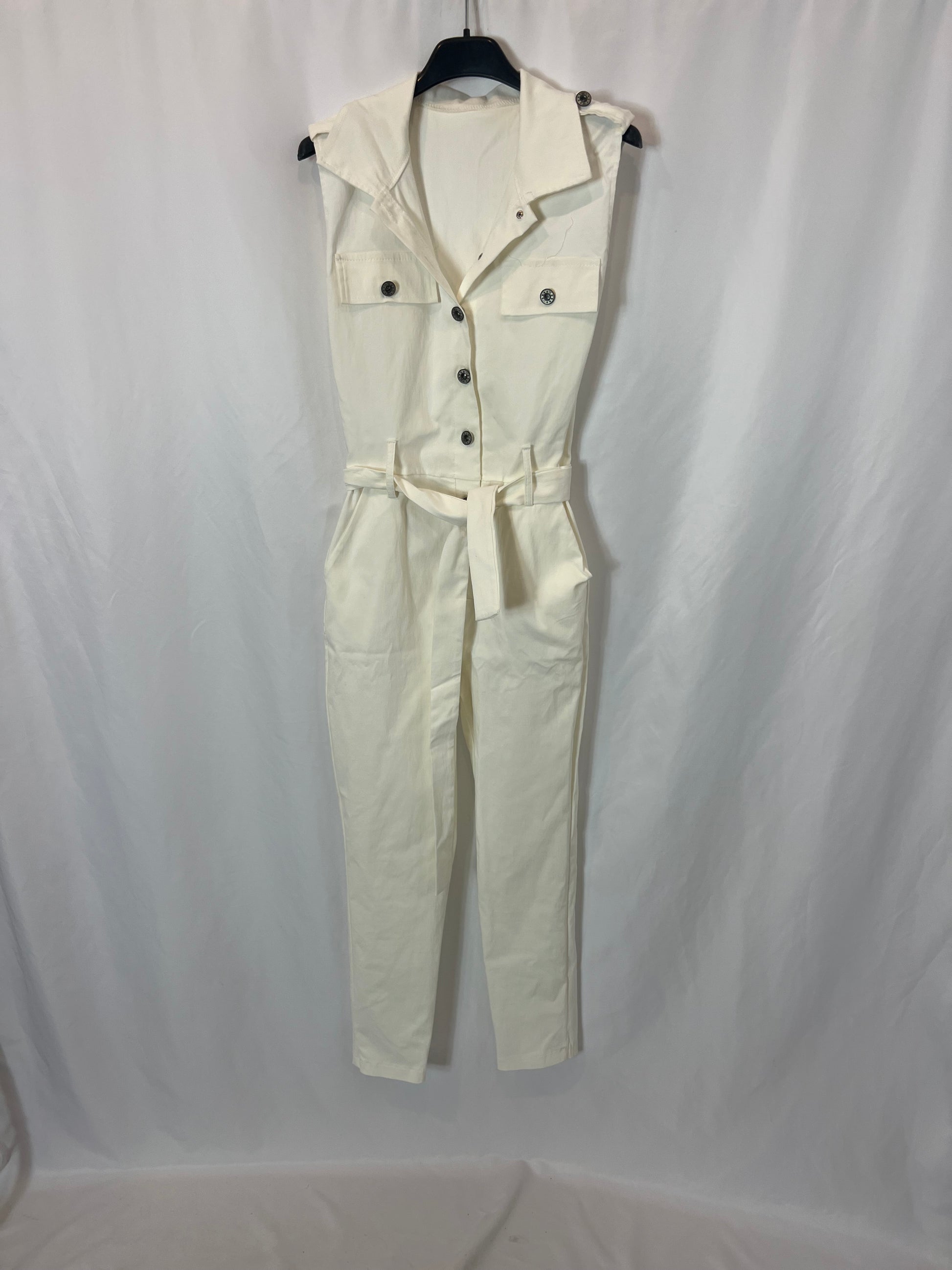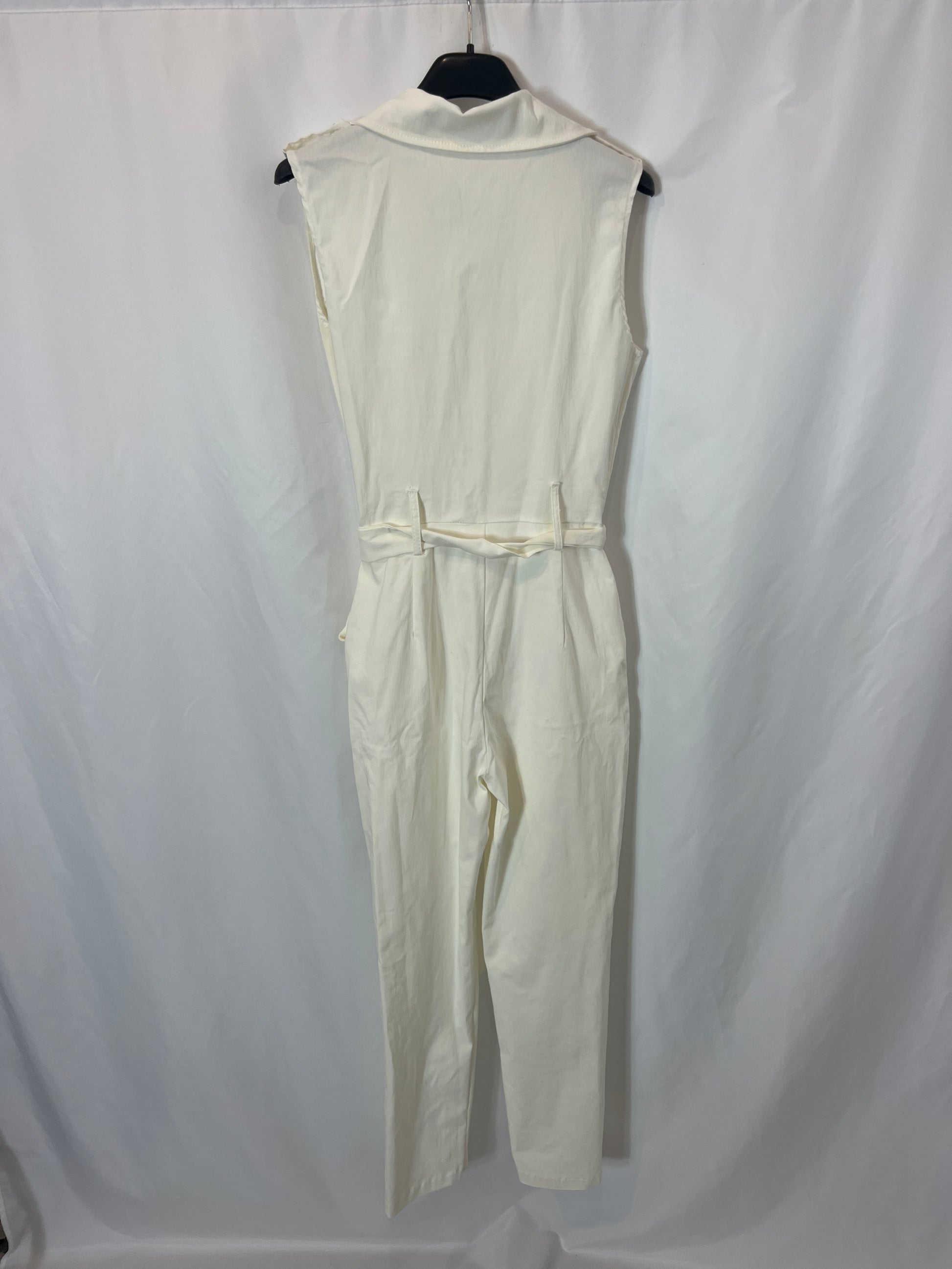 Mono largo blanco de tejido denim elástico abotonado en la parte de arriba con cinturón de lazada . Largo 132cm