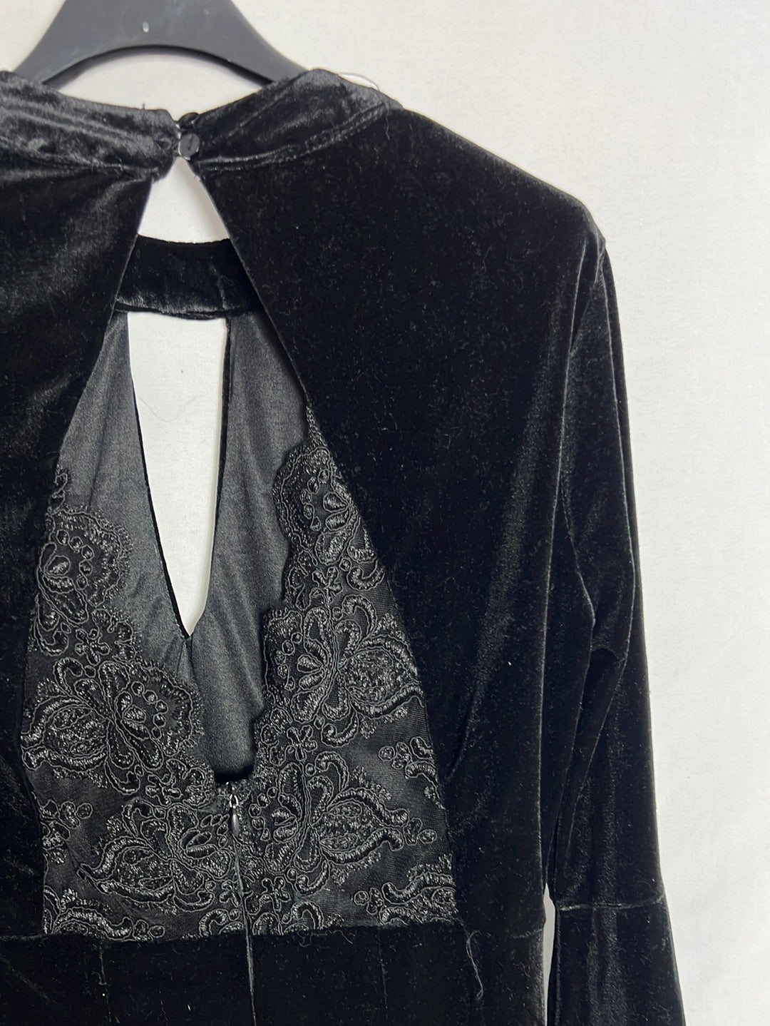 Black velvet short jumpsuit with lace and zipper detail at the back.