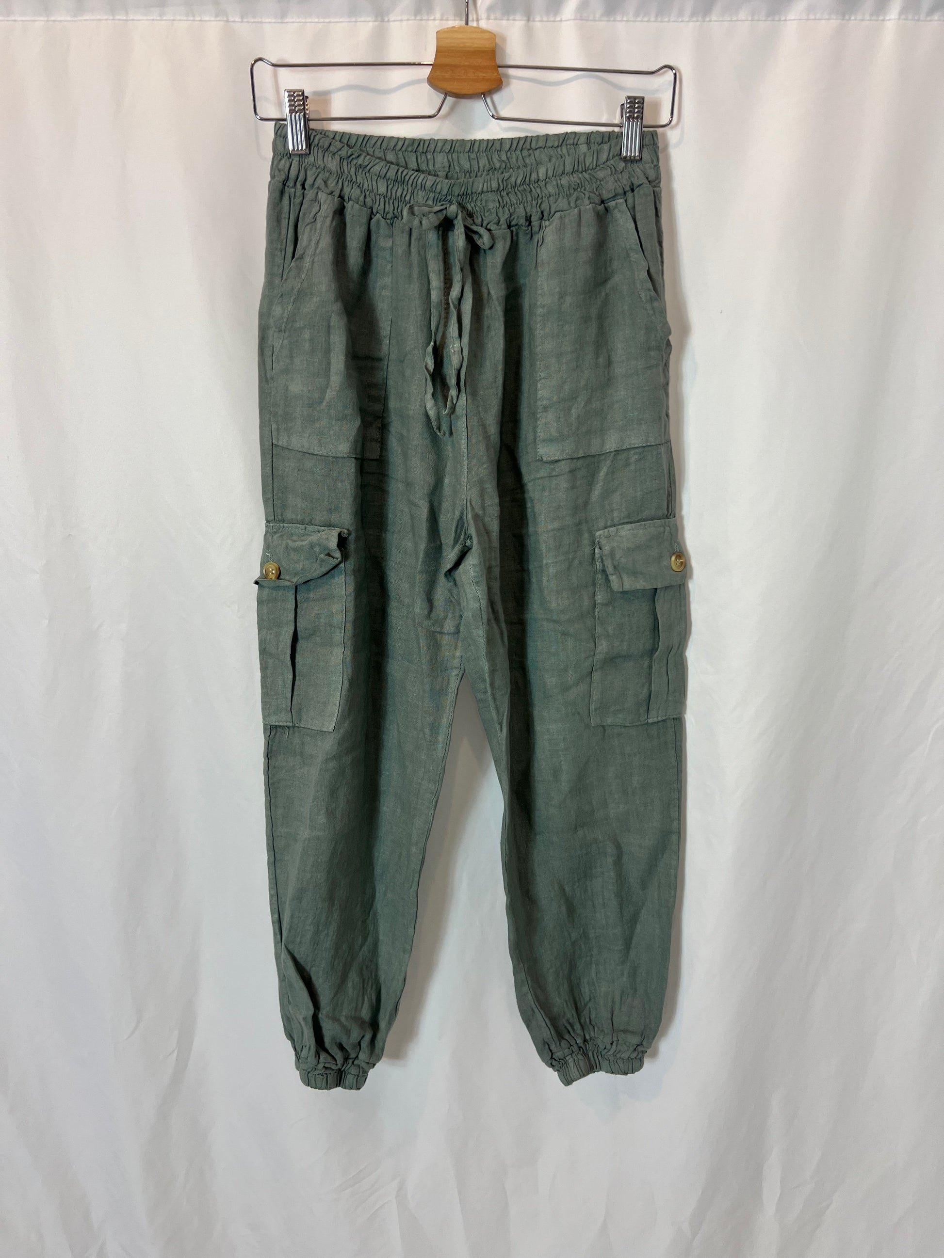 Pantalón cargo verde agua de lino. Cintura elástica. cintura 34cm, largo 92cm