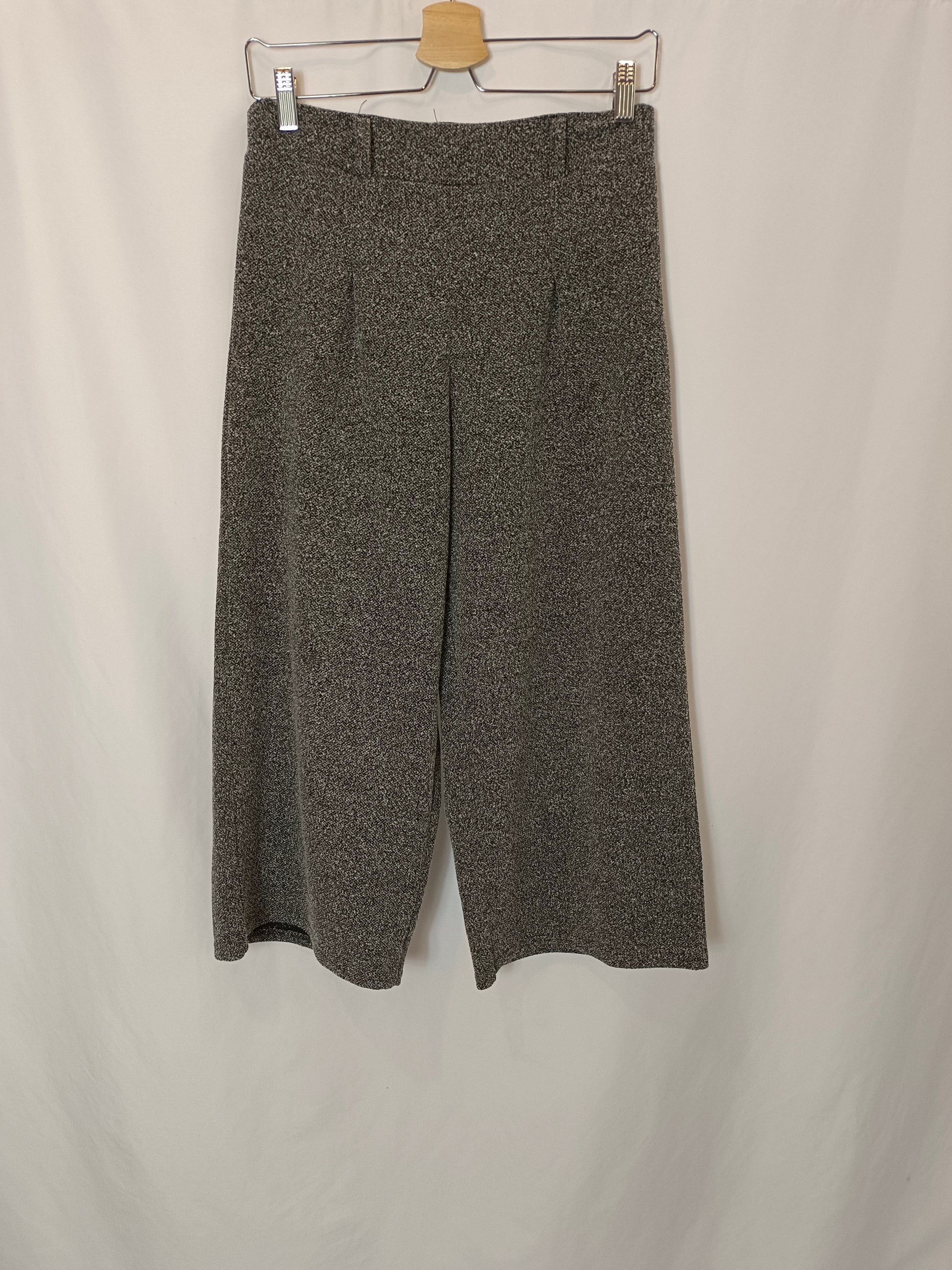 Black and white mottled culottes made of stretch fabric.