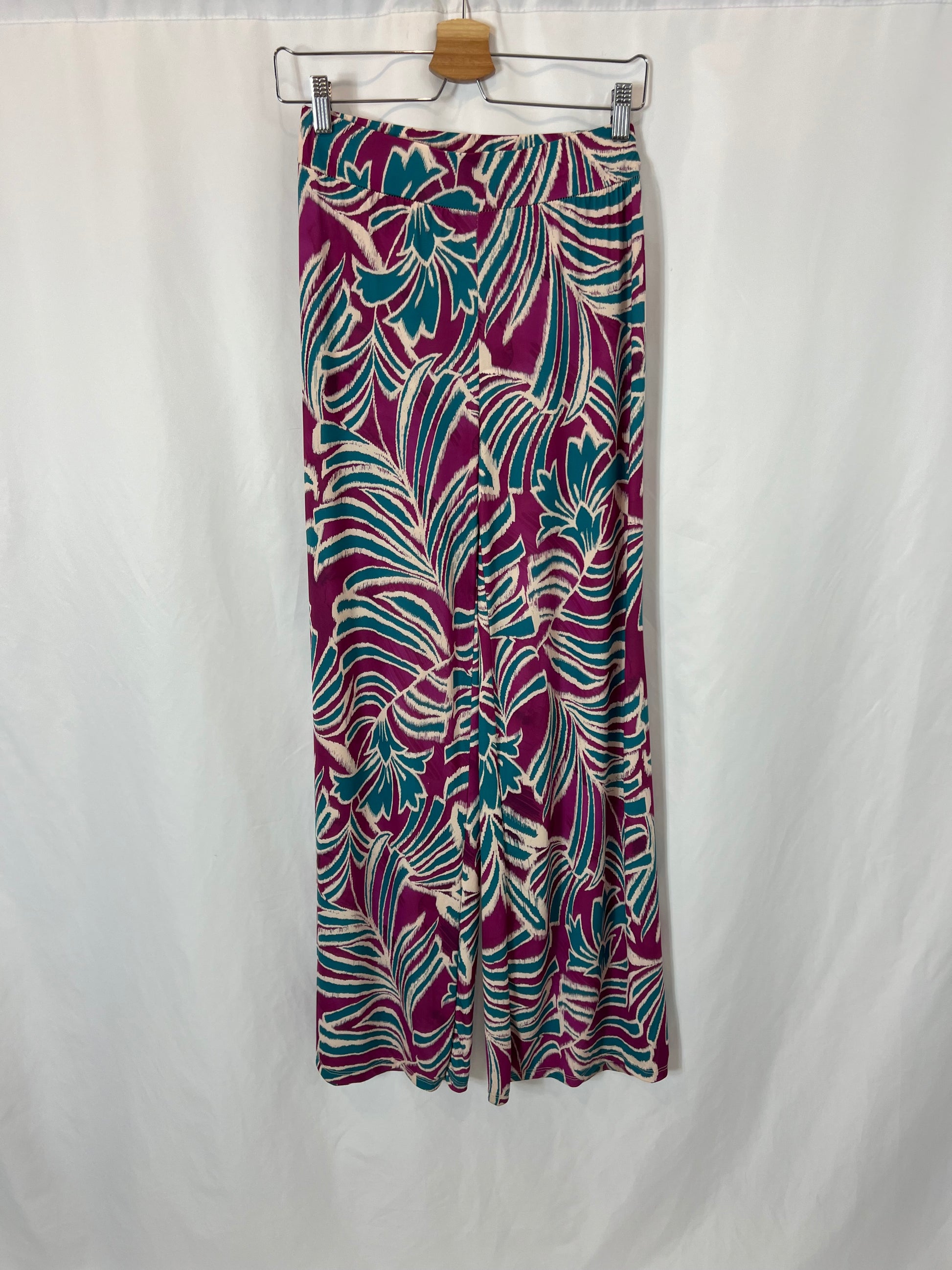 Stretchy, flowy trousers with a purple floral print. Waist 35cm, length 109cm.
