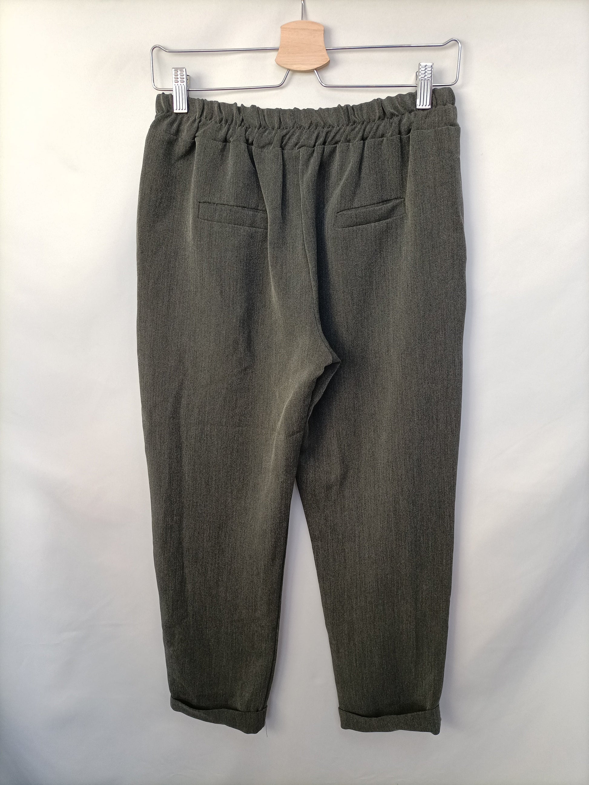 Flowy gray dress-style trousers with a hem. Elastic waist. Slim fit. Length 88 cm.