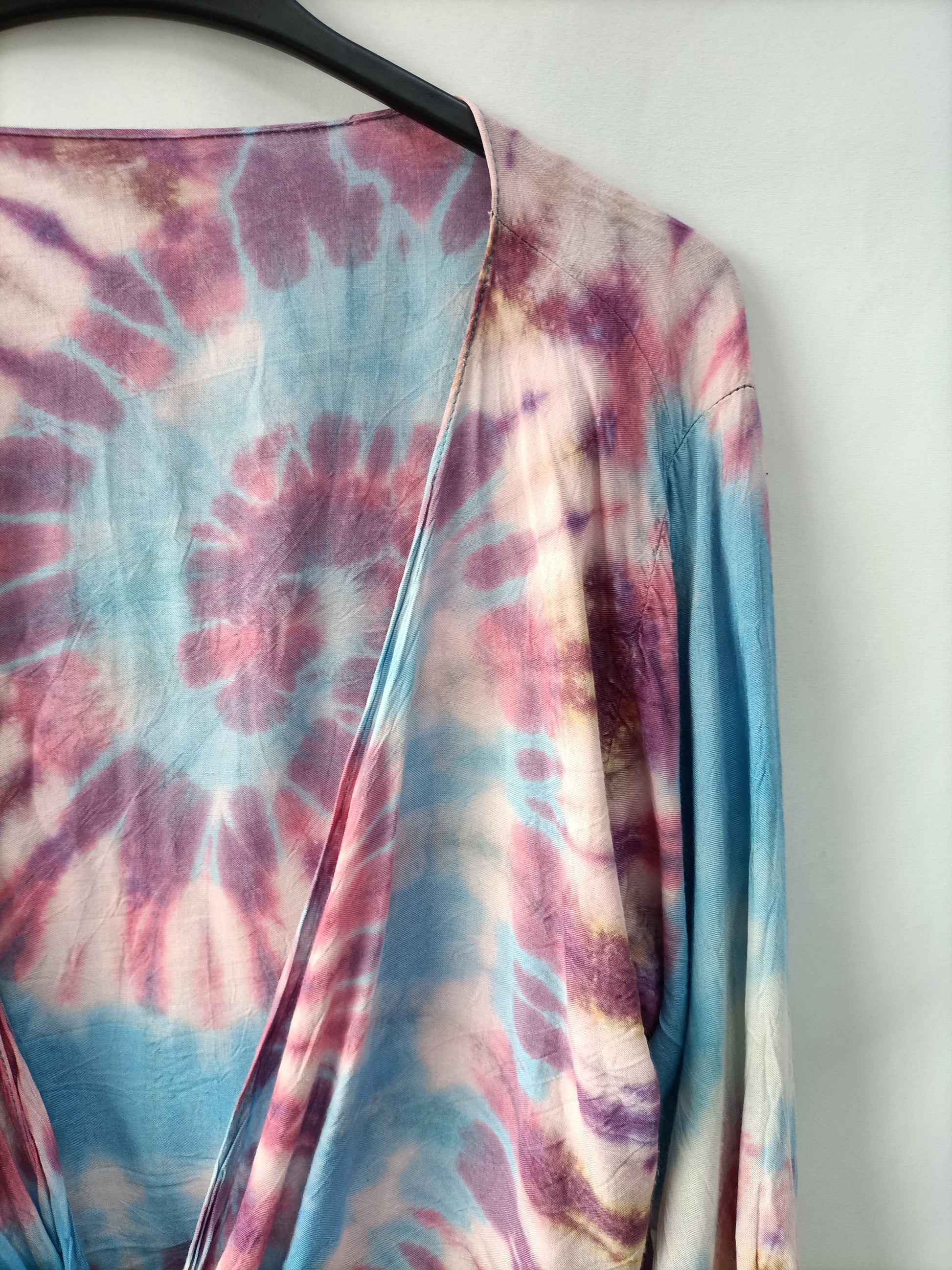 Tie-dye top with a front tie and flared sleeves. Non-stretchy. 54 cm from armhole to armhole and 41 cm long.