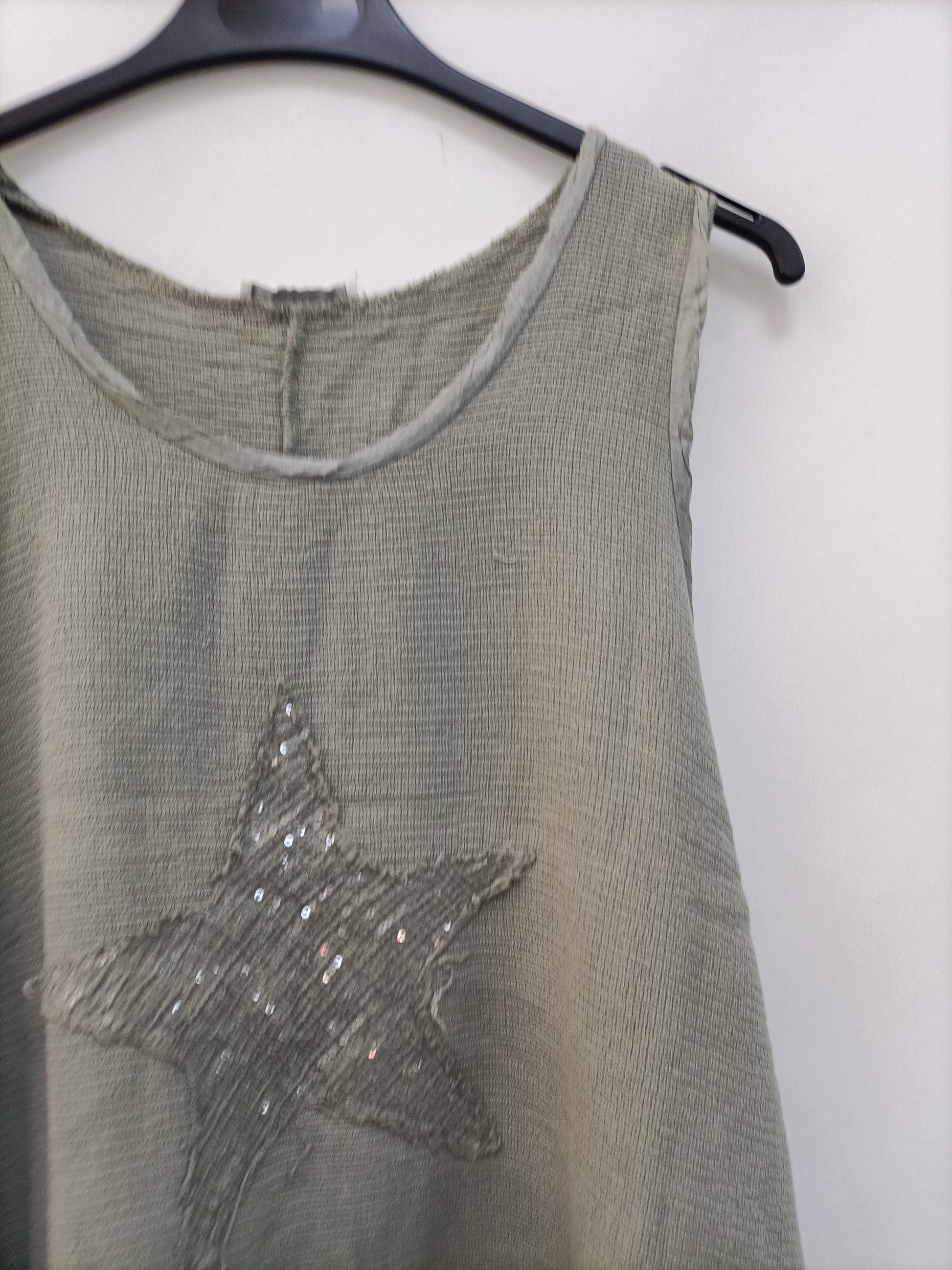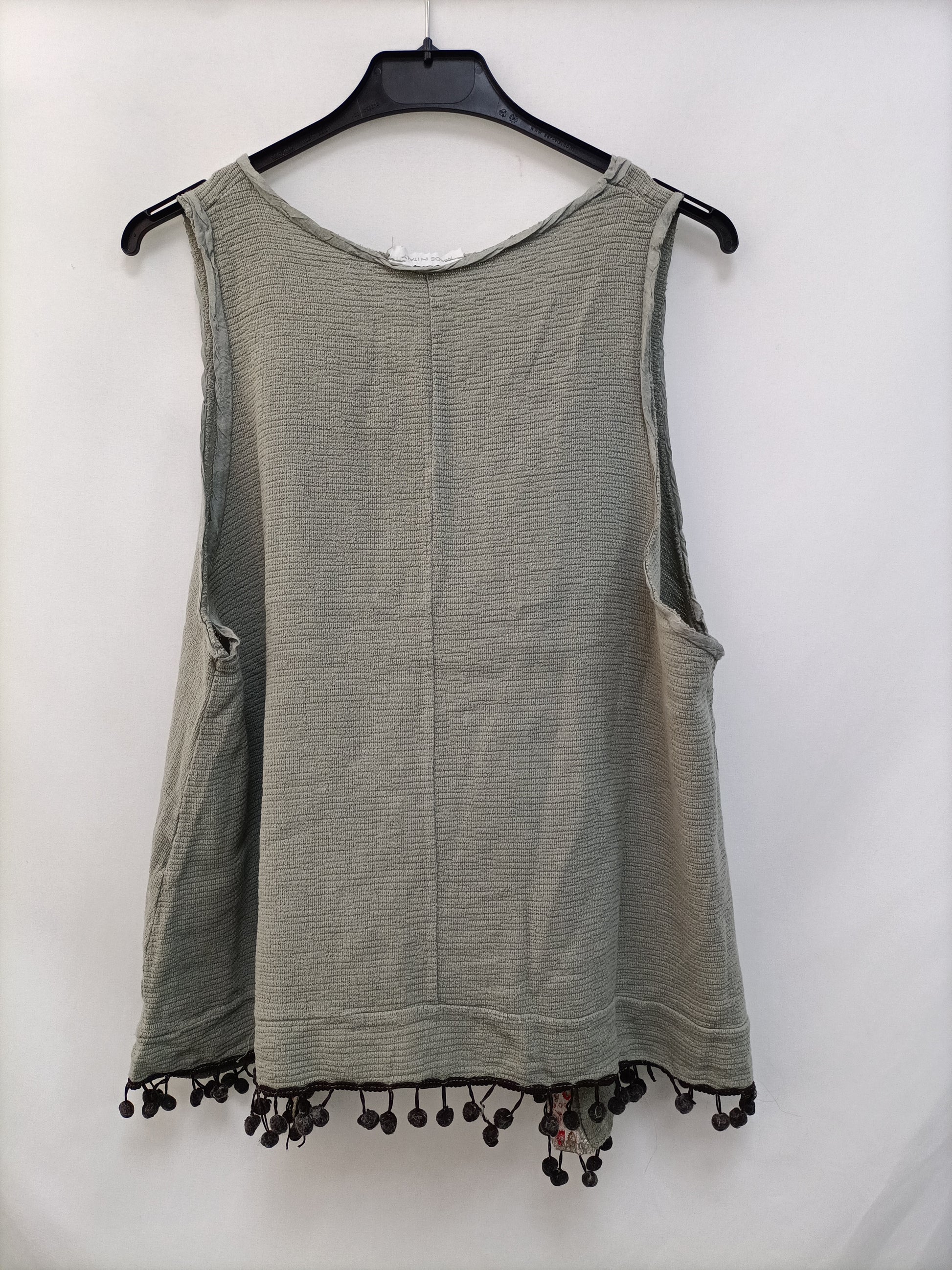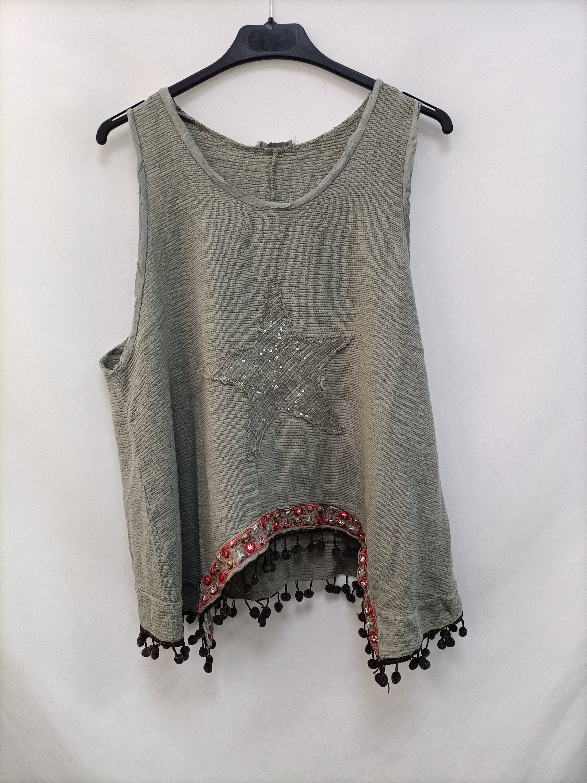 Flowy green top with a mirrored bottom and tassels. 51 cm long.