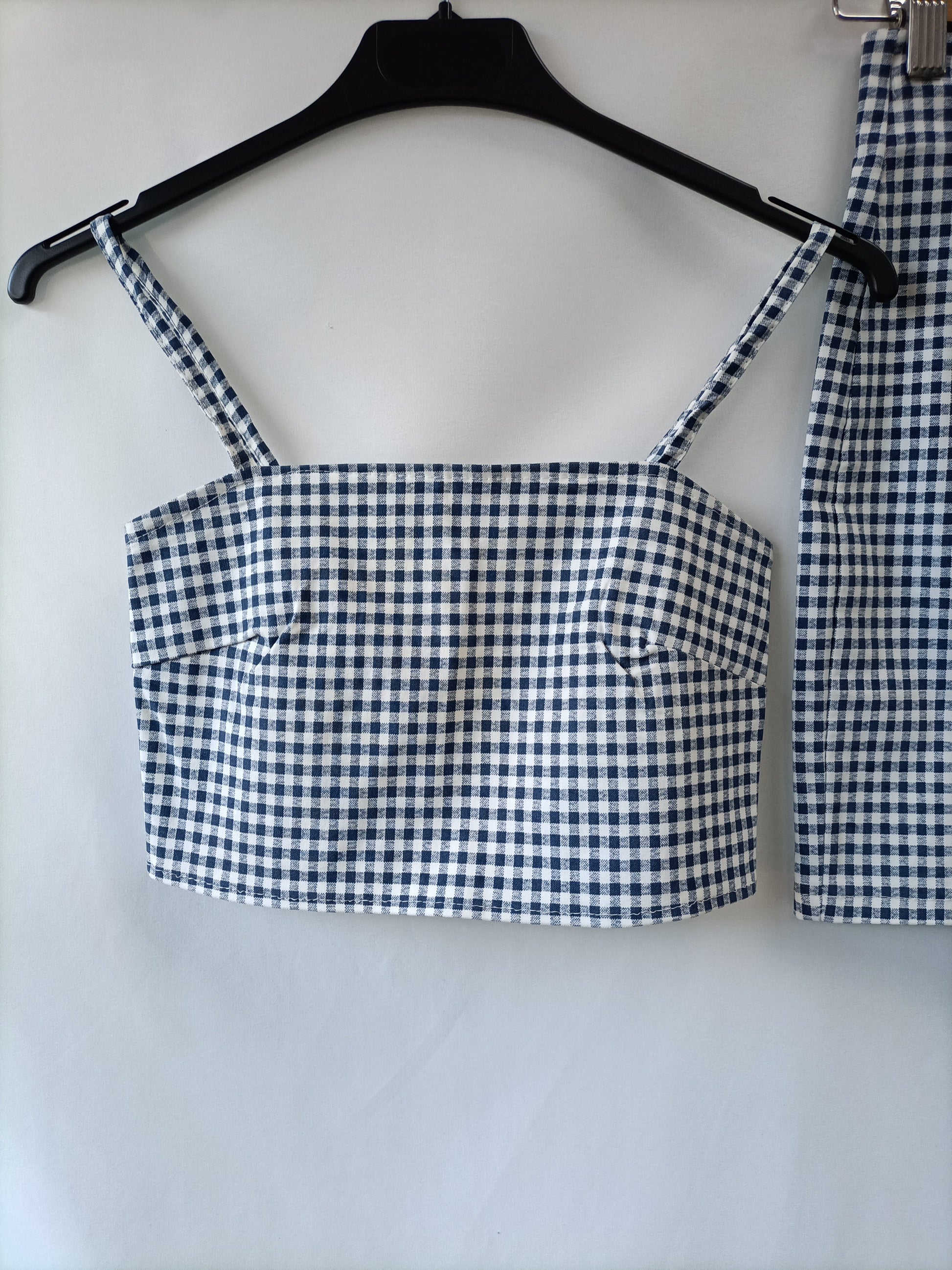 Stretch blue and white gingham total look. Smocked top and mini skirt with slit. Top length: 31 cm, skirt waist: 30 cm, length: 40 cm.