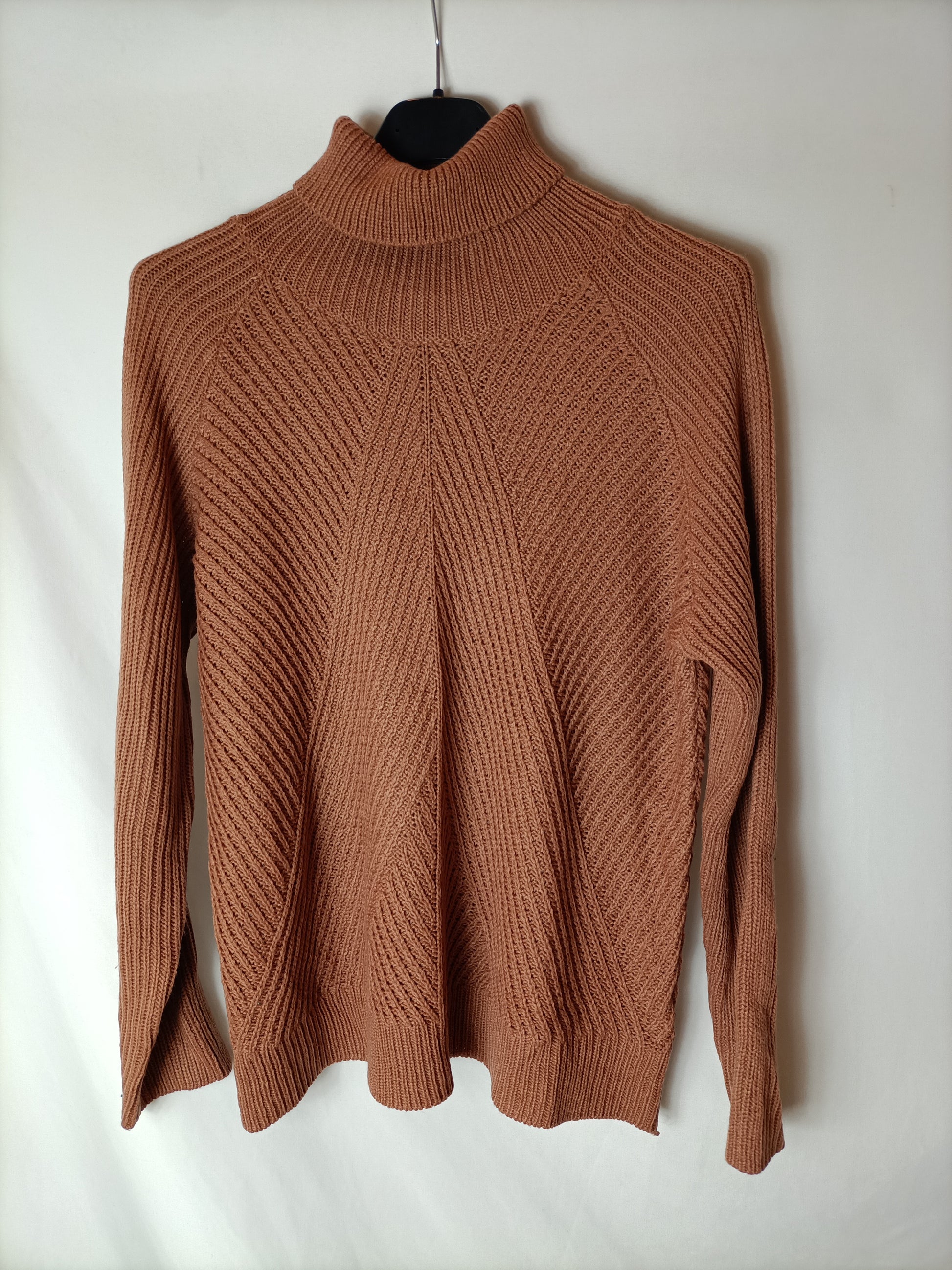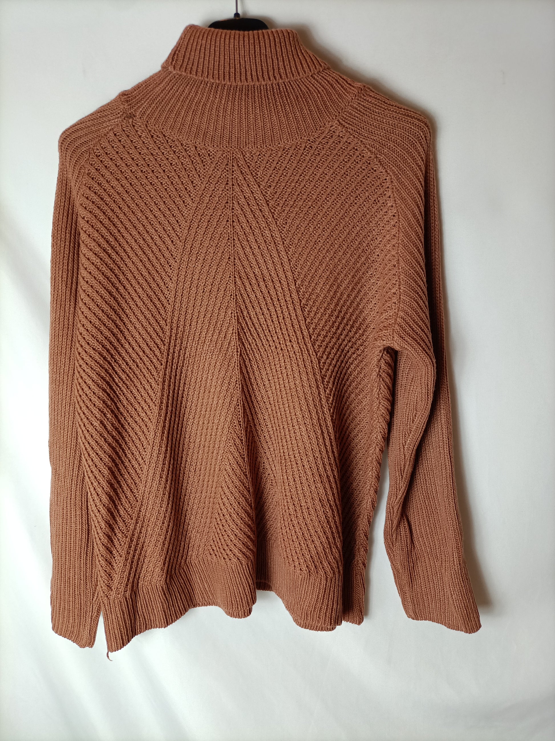 Total look: brown knit skirt and sweater. 65% cotton. Semi-stretch fabric.